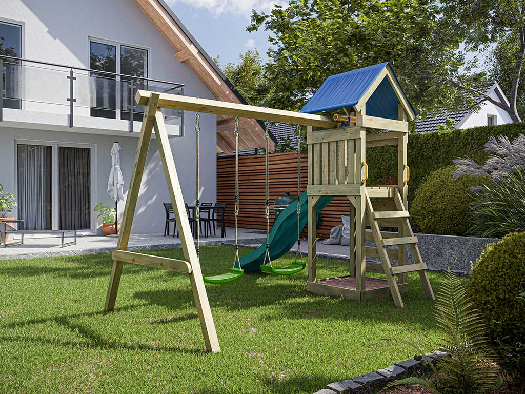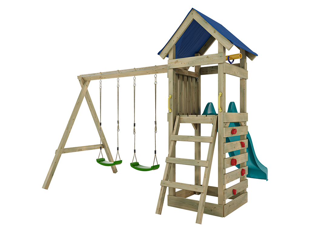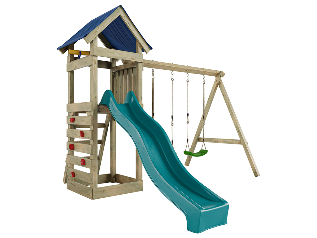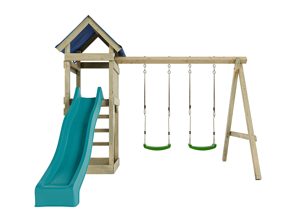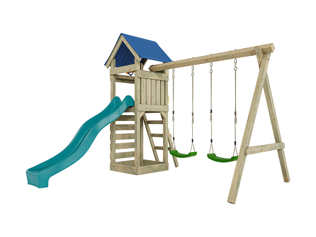 Aire de jeu Easy en bois autoclave avec portique, 2 balançoires, toboggan turquoise + sièges verts