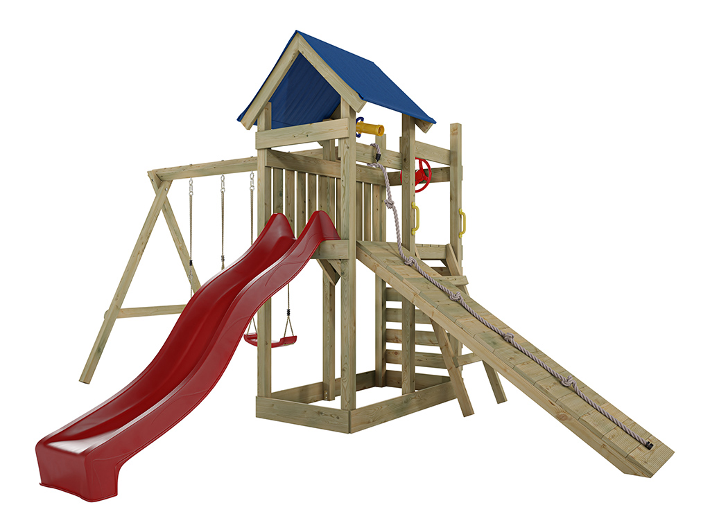 Aire de jeu Hefty en bois autoclave avec portique, 2 balançoires, toboggan rouge + sièges rouges