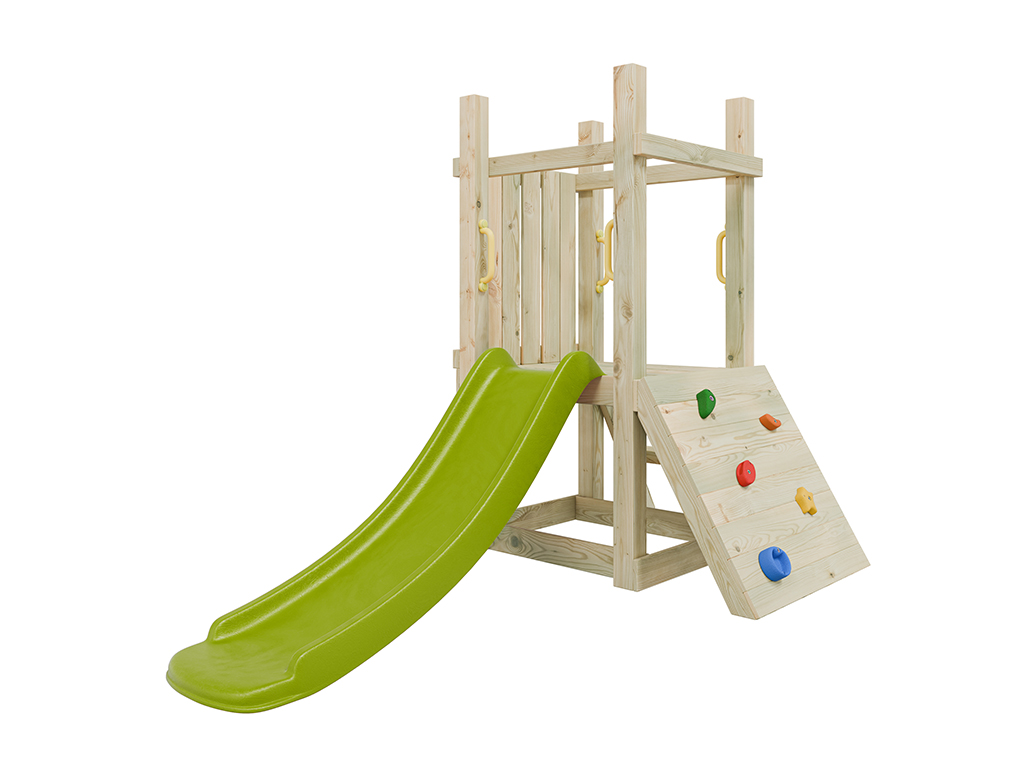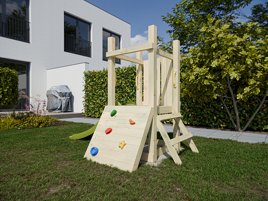 Cette aire de jeu offre tout ce qui amuse les tout-petits : glisser, grimper et s’inventer des histoires. Grâce à sa taille compacte, elle s’intègre facilement dans tous les jardins. - Avec toboggan et mur d'escalade