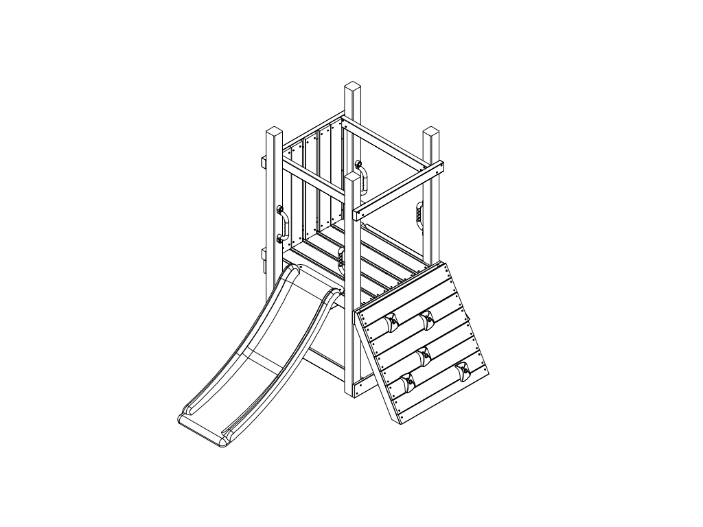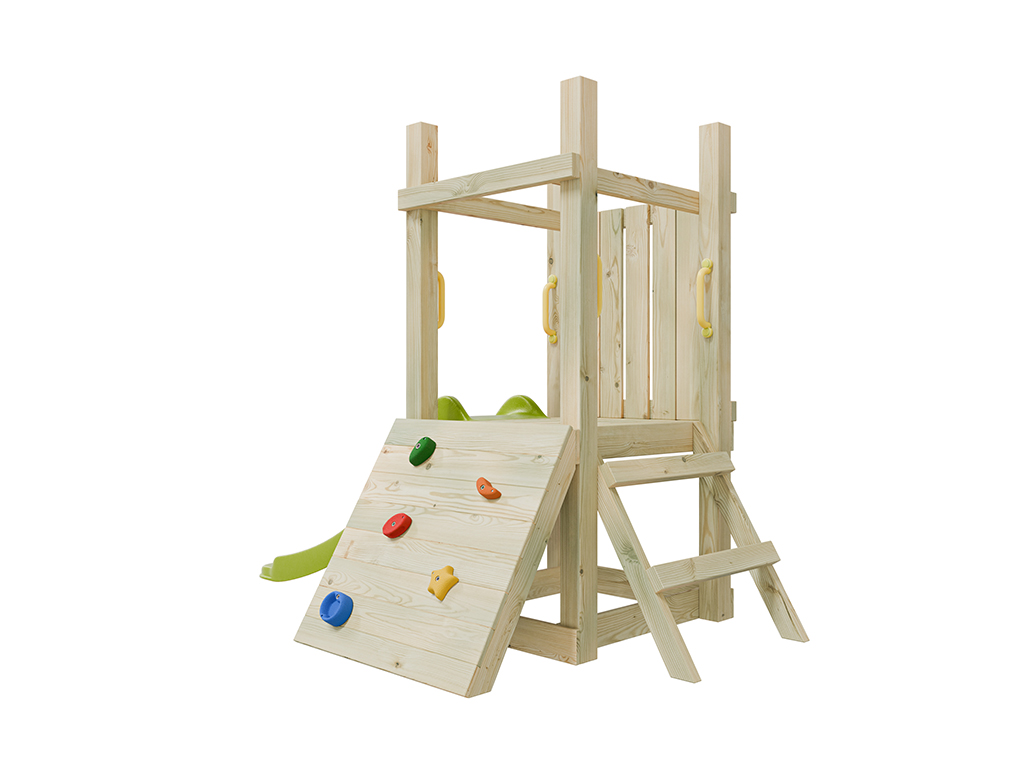 L’aire de jeu est équipée d’un toboggan qui se fixe à la plateforme de 60 cm de hauteur. Les enfants peuvent accéder à la plateforme soit par l’échelle à deux marches, soit par le mur d’escalade doté de 5 prises colorées. - Avec quatre poignées