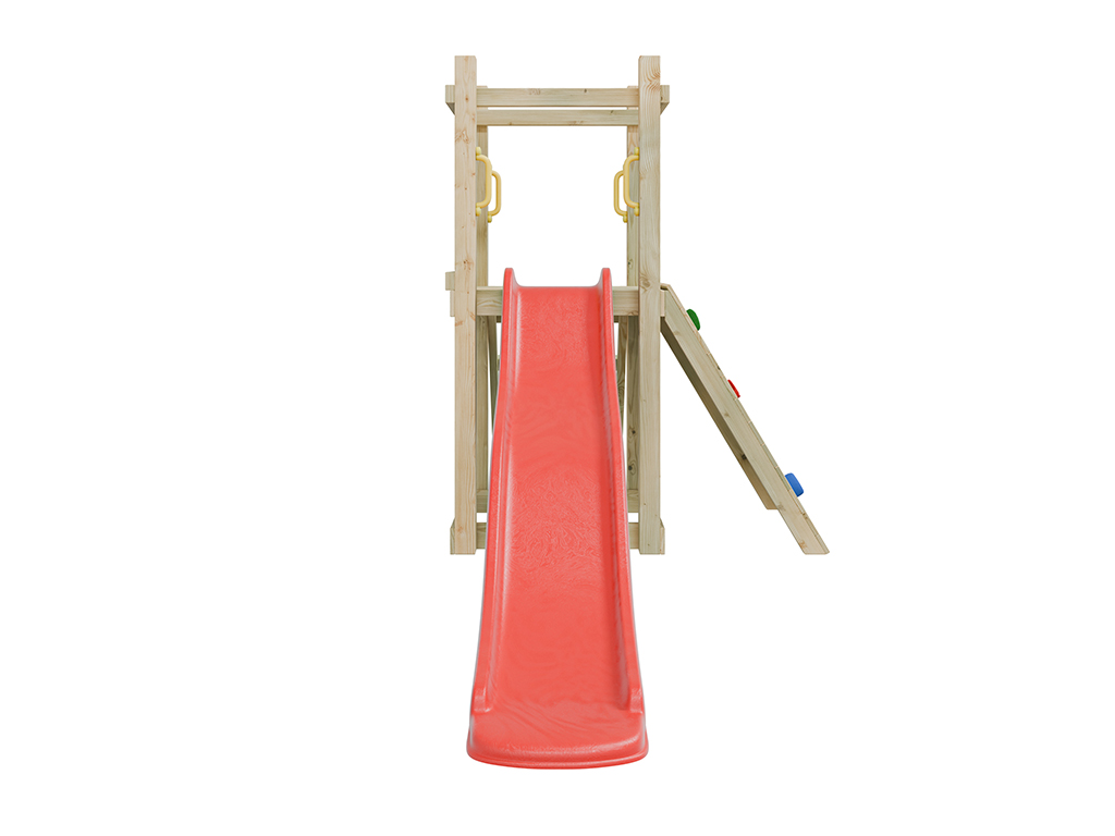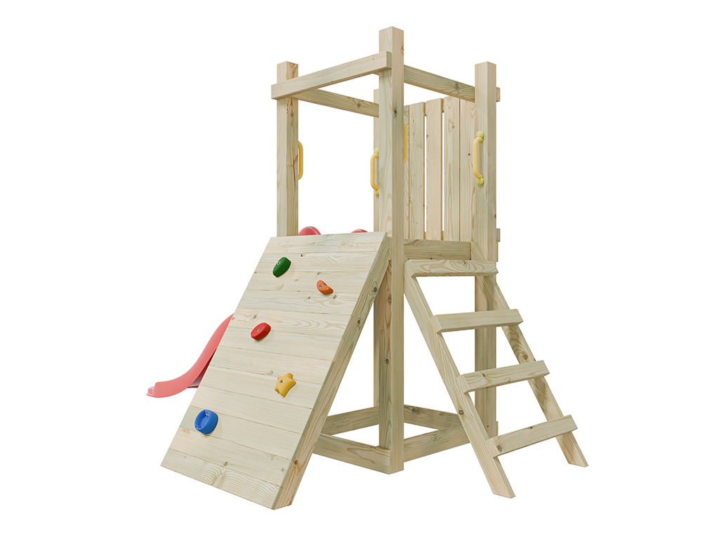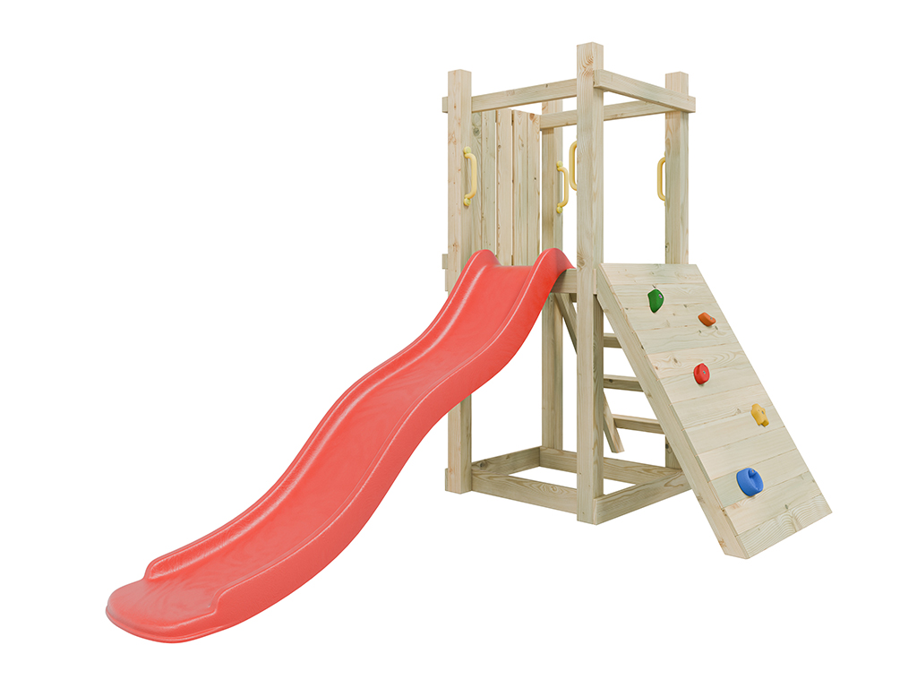 L’aire de jeux est équipée d’un toboggan fixé à la plateforme de 90 cm de haut. Les enfants peuvent accéder à la plateforme soit par une échelle à quatre marches, soit par un mur d’escalade avec 5 prises colorées. - Avec quatre poignées de maintien