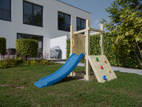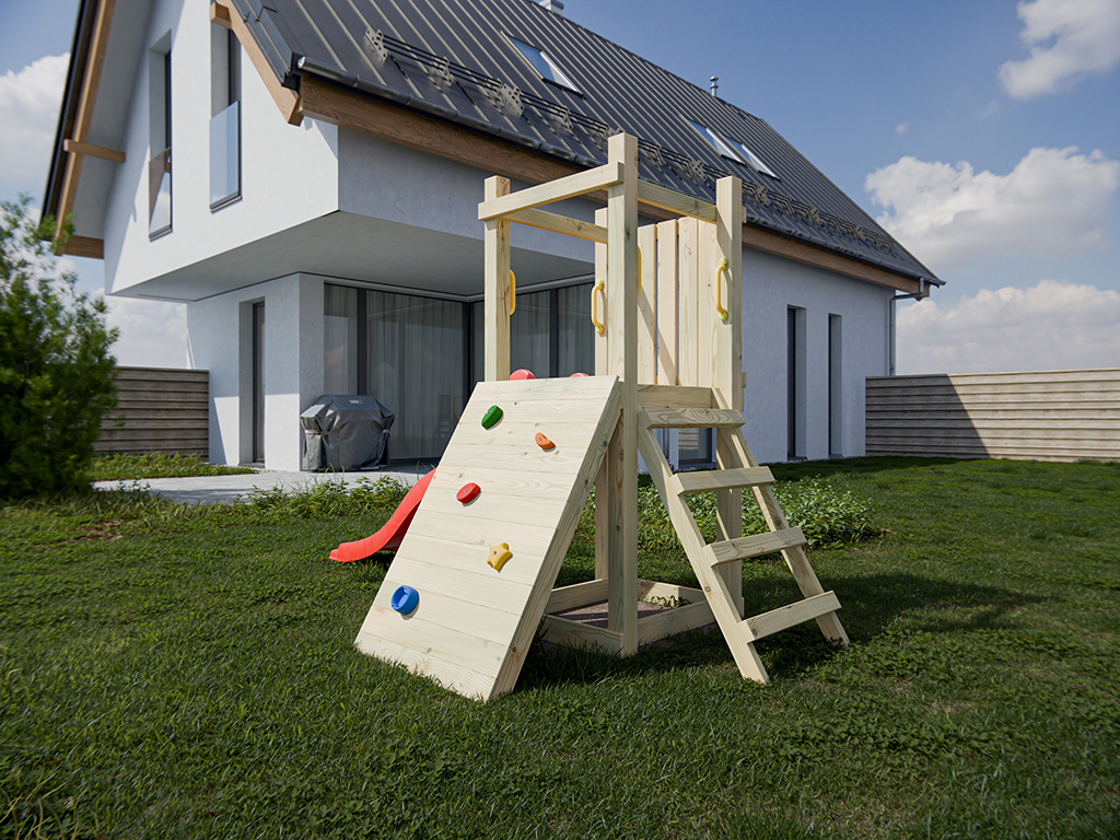 Cette aire de jeux offre tout ce qui amuse les tout-petits : glisser, grimper et s'inventer des histoires. Grâce à ses dimensions compactes, elle s’intègre facilement dans tous les jardins. - Avec toboggan et mur d'escalade