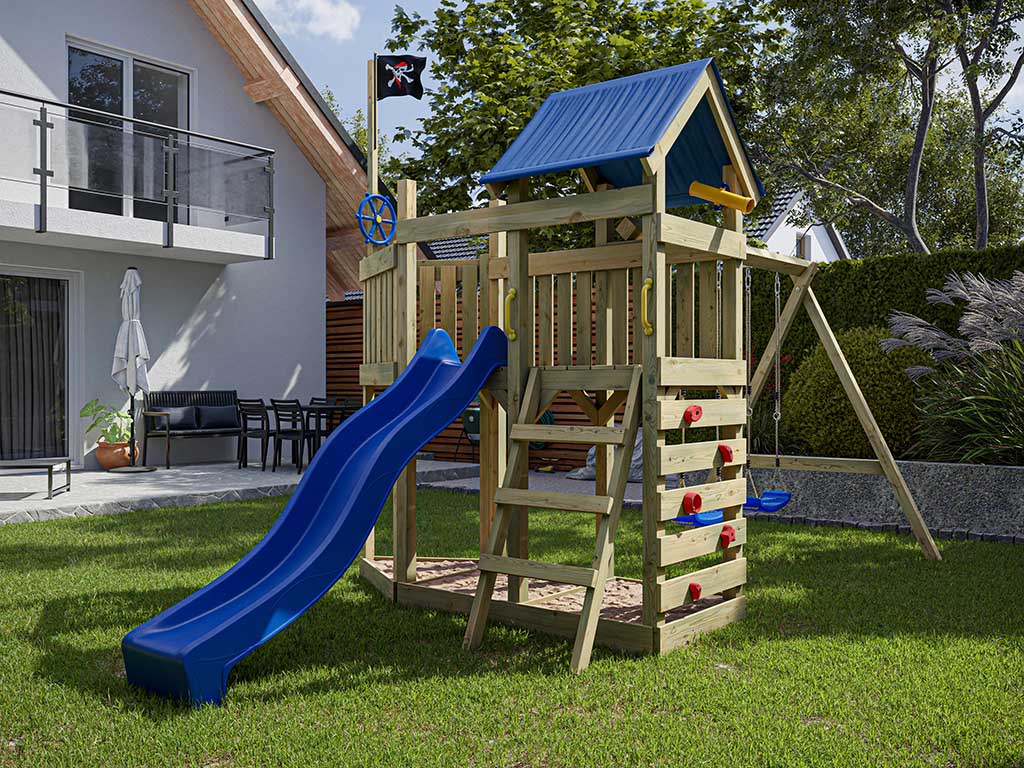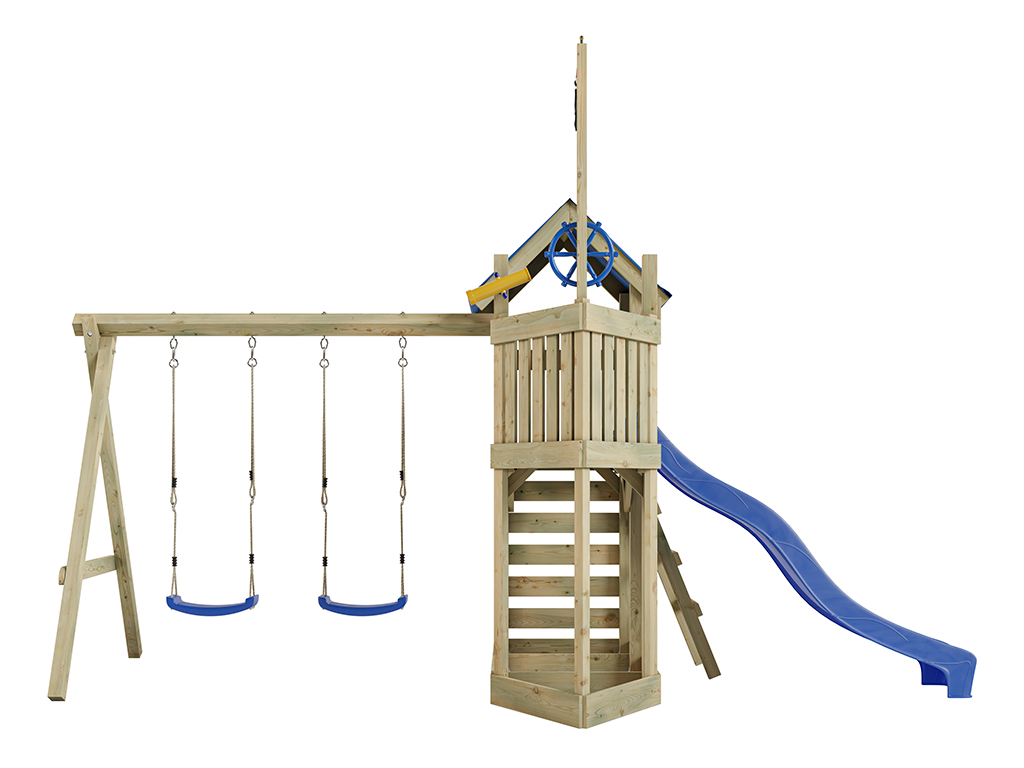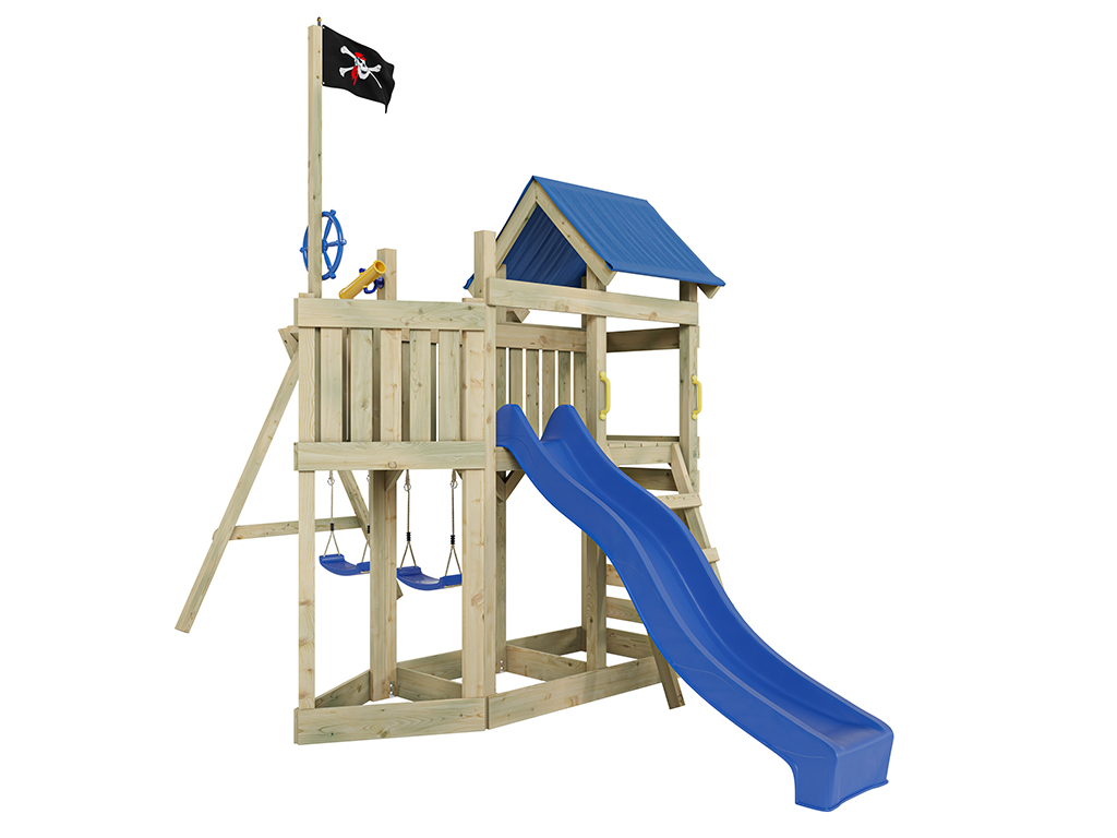 Aire de jeu Pirate Captain Snappy en bois autoclave avec portique double, toboggan bleu et sièges bl