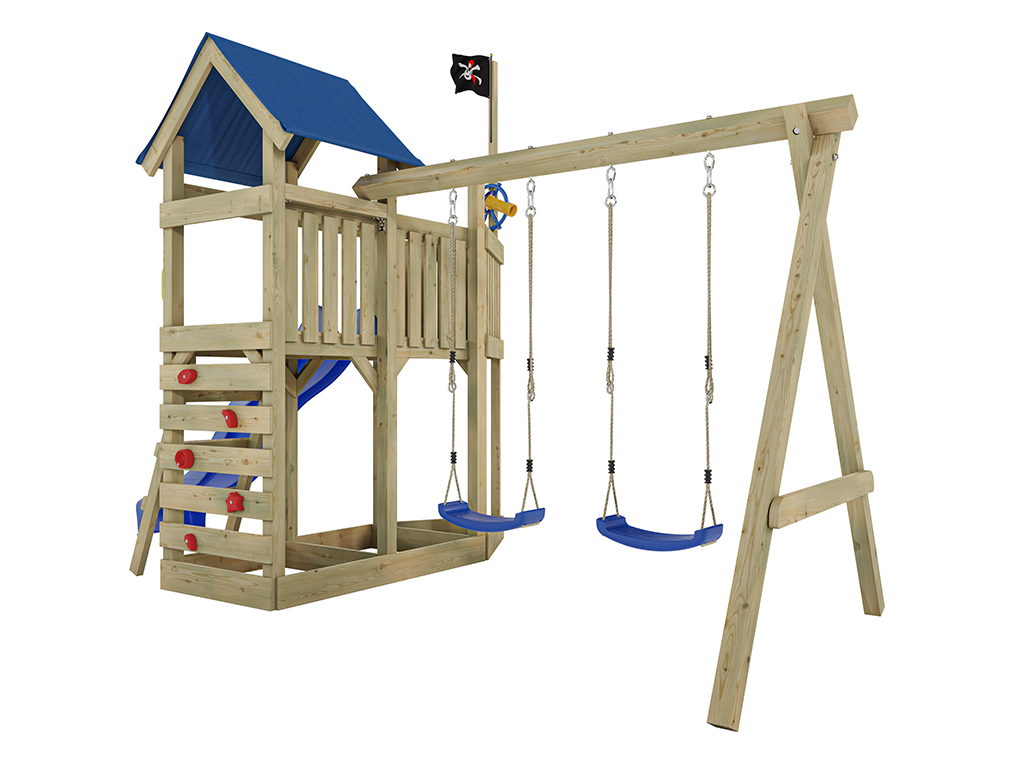 - Aire de jeux Captain Jolly en bois autoclave, toit en bâche, extension de plateforme, portique double, 2 sièges de balançoire ou 1 balançoire-nid (selon l'option choisie), 4 crochets pour balançoires, 2 poignées, bac à sable, échelle, 1 longue-vue, 1 volant, 1 toboggan