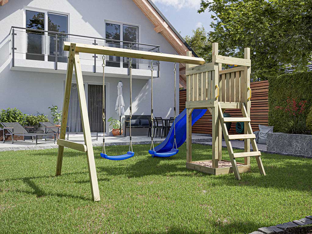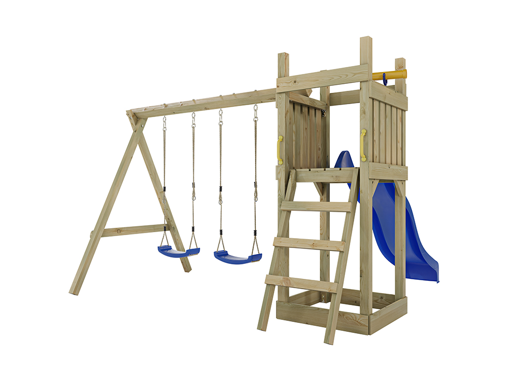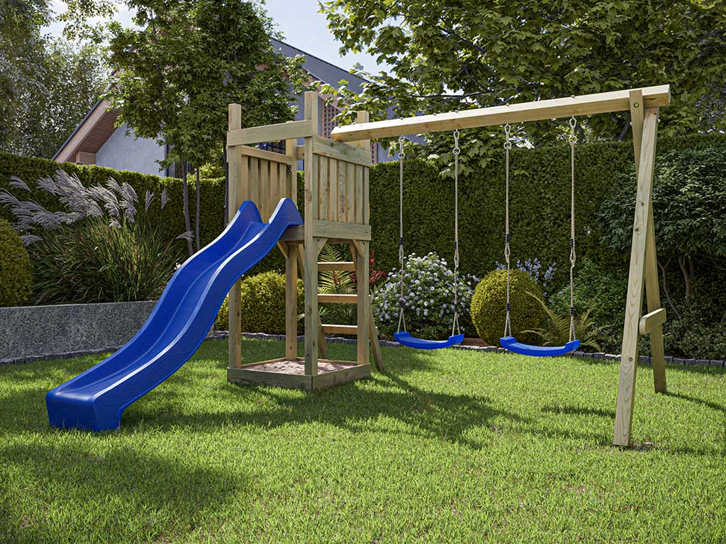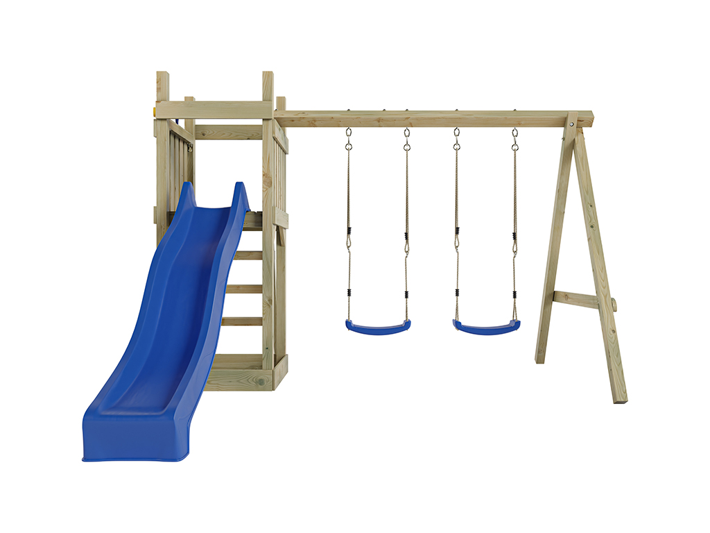 Aire de jeu Skinny en bois autoclave avec portique, 2 balançoires, toboggan bleu + sièges bleus
