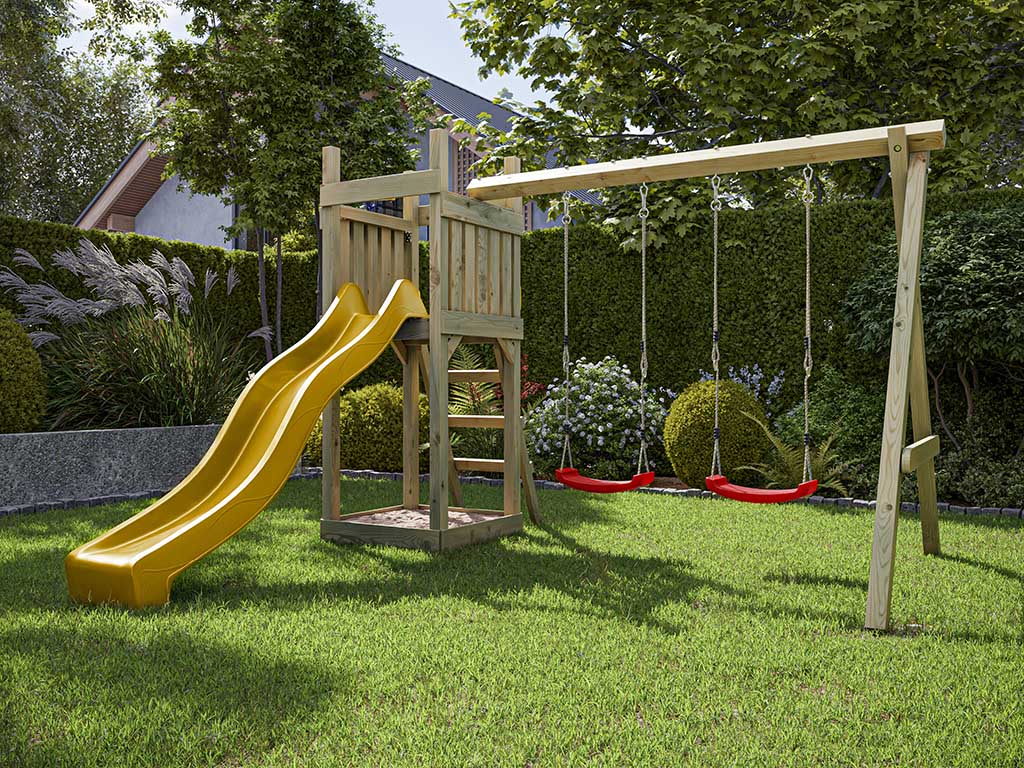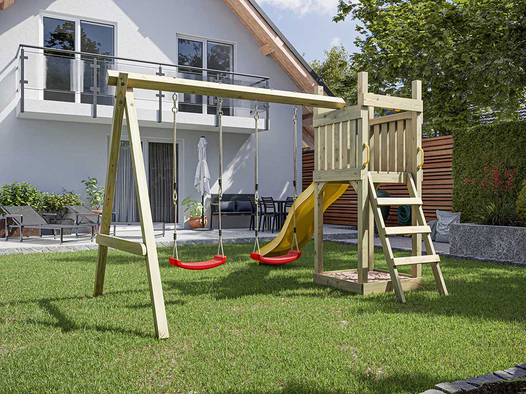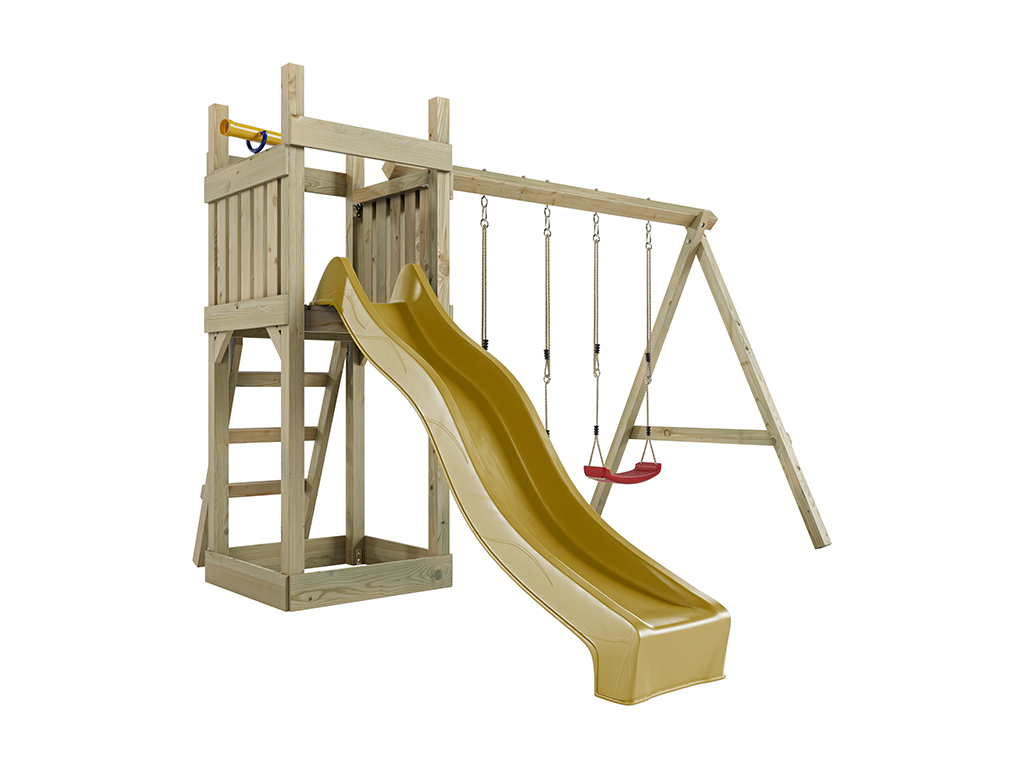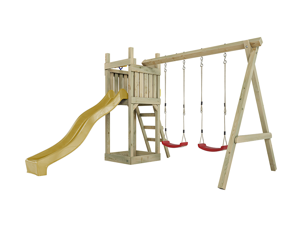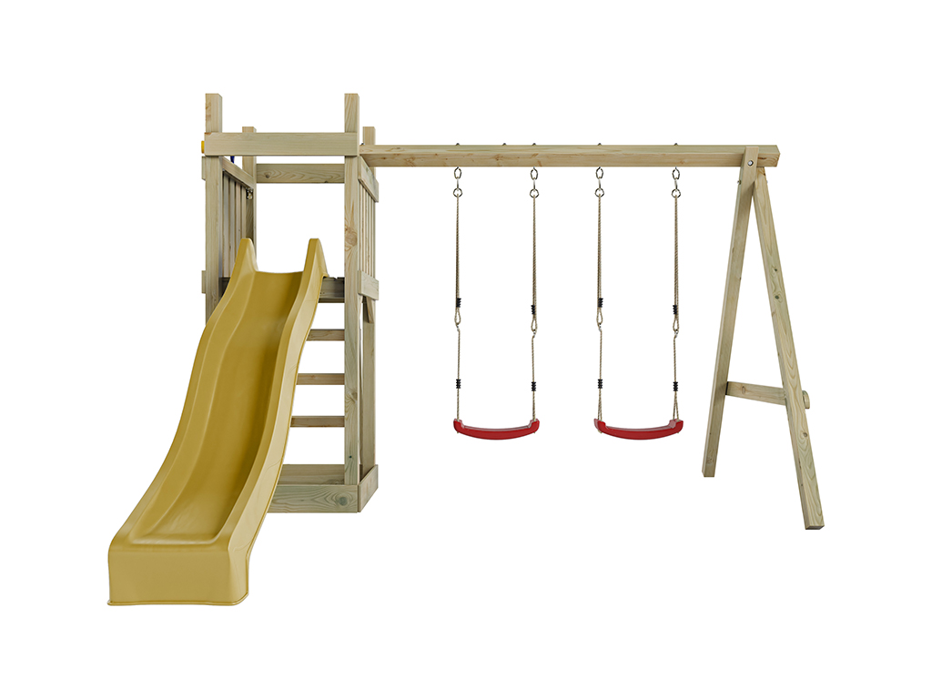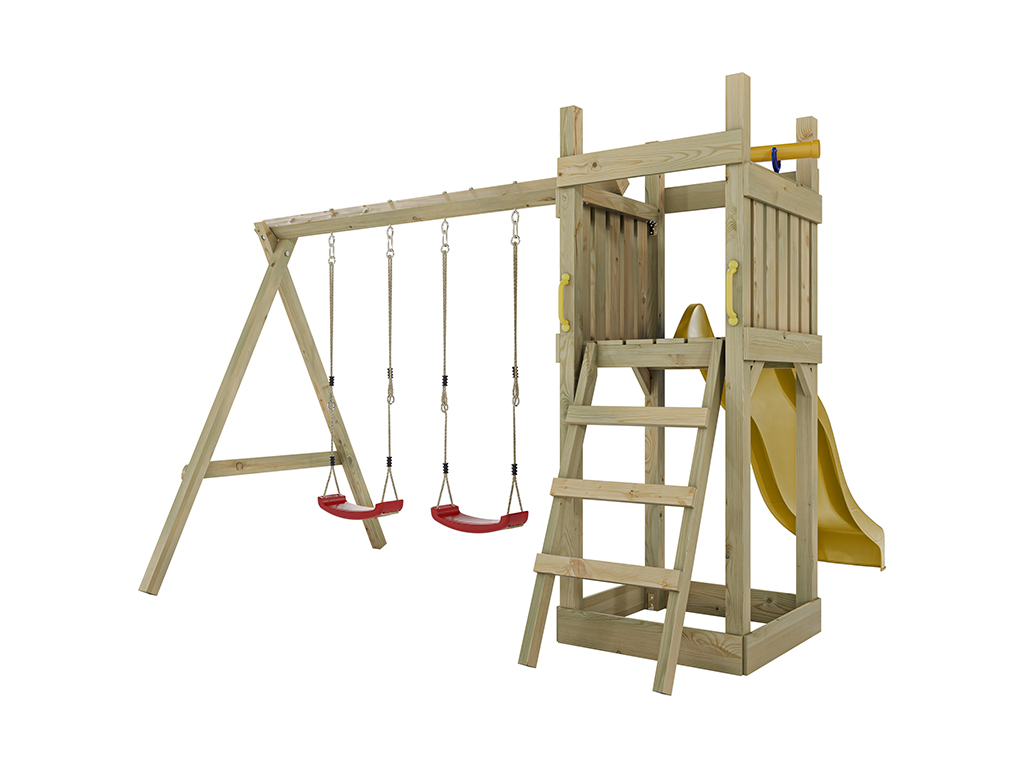 Aire de jeu Skinny en bois autoclave avec portique, 2 balançoires, toboggan jaune + sièges rouges