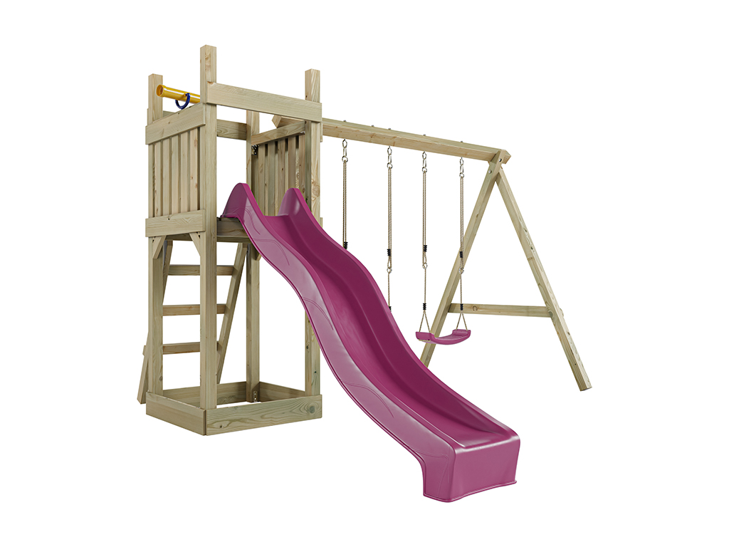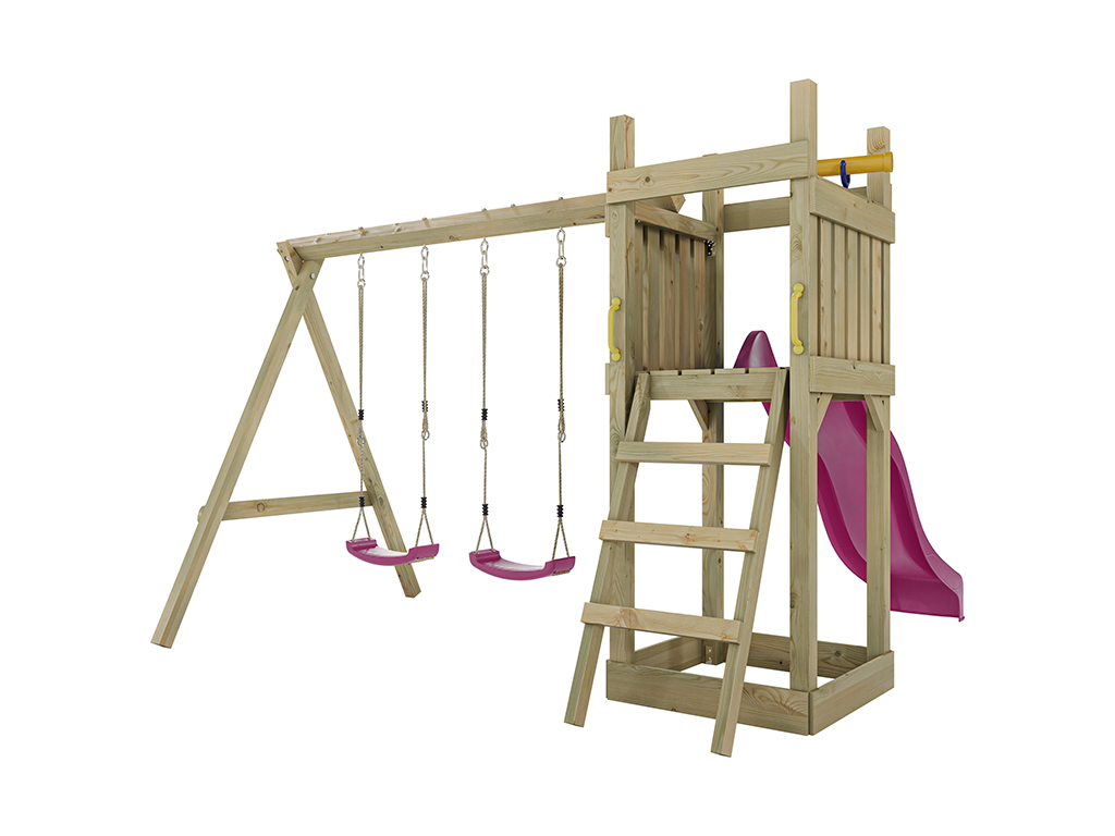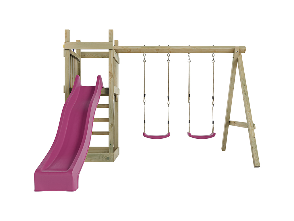 Aire de jeu Skinny en bois autoclave avec portique, 2 balançoires, toboggan rose + sièges roses