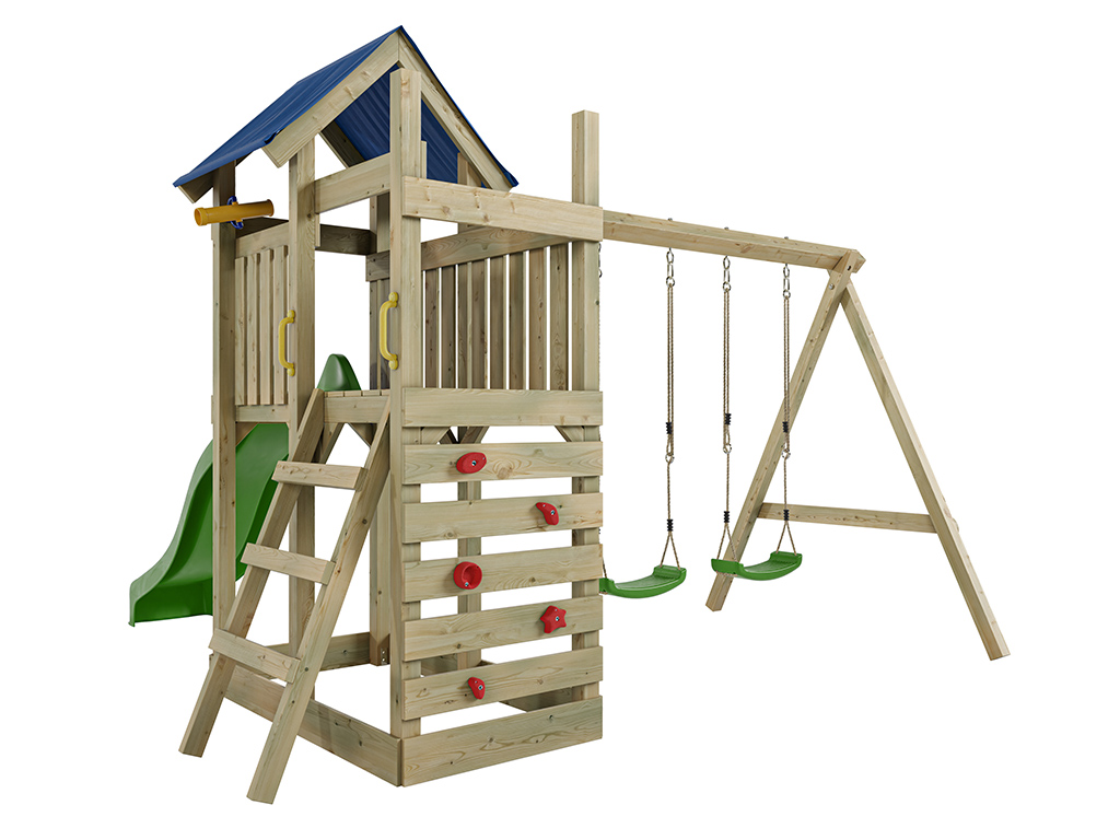 - Aire de jeu Speedy en bois autoclave, toit en bâche, portique, 2 sièges de balançoire ou 1 balançoire nid (aux choix), 4 crochets de balançoire, 2 poignées, bac à sable, échelle, mur d'escalade, prises d'escalade, 1x télescope, 1x toboggan
