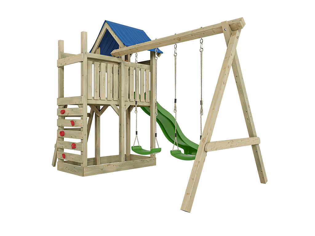 Aire de jeu Speedy en bois autoclave avec portique, 2 balançoires, toboggan vert + sièges verts