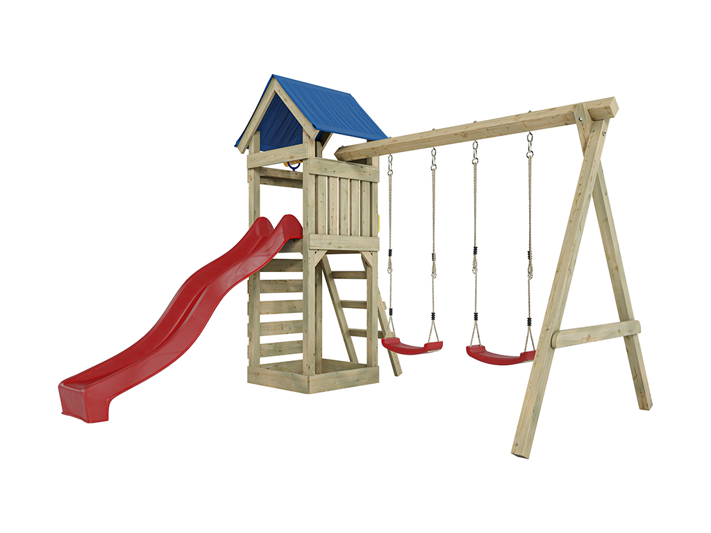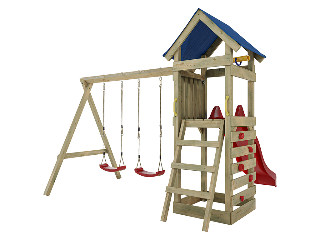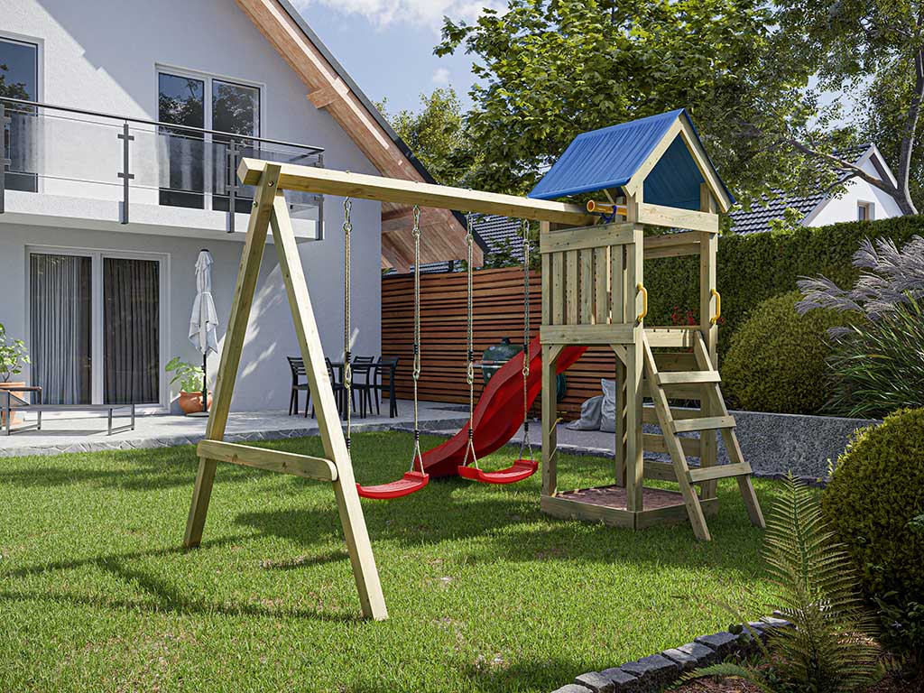 - Portique double inclus, en bleu, avec une poutre de balançoire robuste de 9 x 9 cm.
