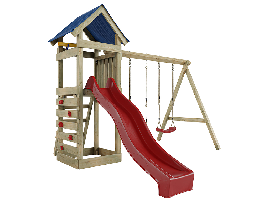 - Aire de jeux Easy en bois autoclave, toit en bâche, portique double, 2x sièges de balançoire ou 1x balançoire nid (selon votre choix), 4 crochets de balançoire, 2 poignées, bac à sable, échelle, mur d’escalade, pierres d’escalade, 1x longue-vue, 1x toboggan