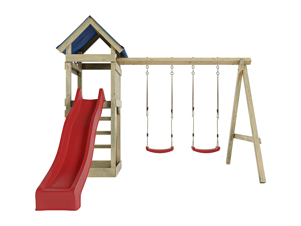 Aire de jeux Easy en bois autoclave avec portique double, toboggan rouge et sièges rouges