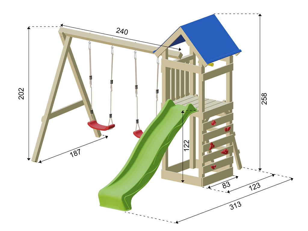 Cette aire de jeux offre à vos enfants des moments uniques de jeu, d’aventure et de mouvement – un véritable rêve pour les petits explorateurs ! Les dimensions extérieures de cette aire de jeux en bois sont de 327 x 317 cm, avec une hauteur de faîtage de 258 cm.