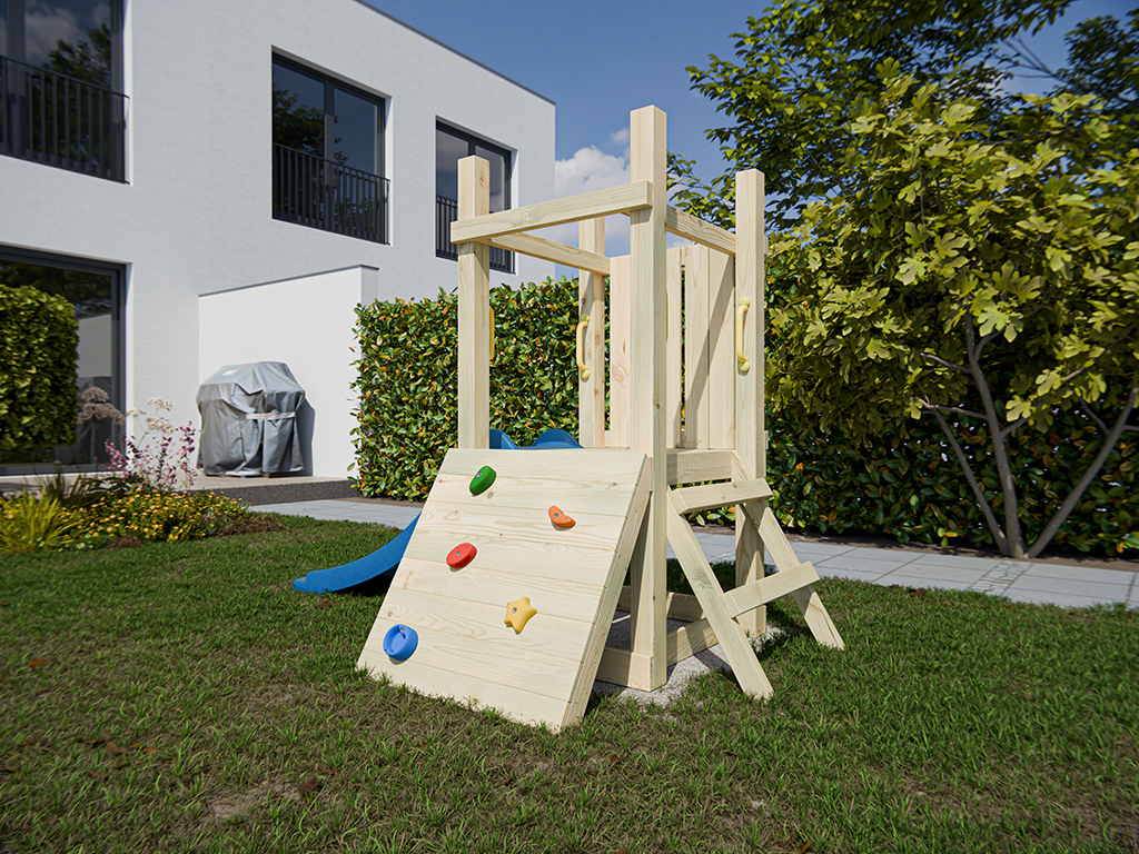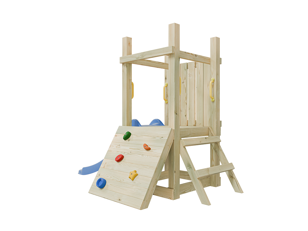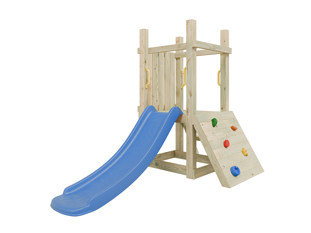 Cette aire de jeux offre tout ce qui plaît aux tout-petits : glisser, grimper et s’amuser avec des jeux de rôle. Grâce à son format compact, elle s’intègre facilement dans tous les jardins. - Avec toboggan et mur d’escalade