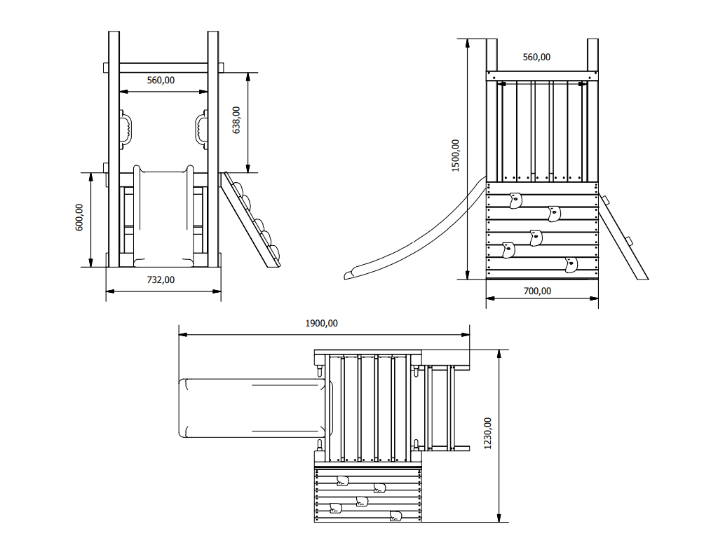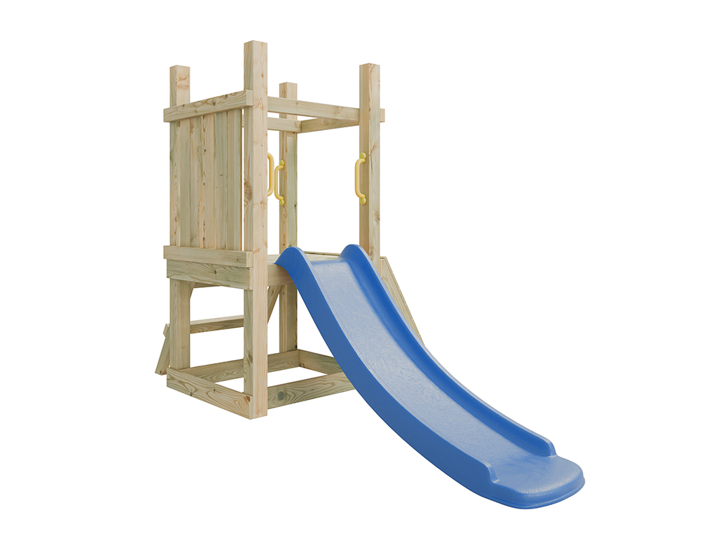 L’aire de jeux est équipée d’un toboggan fixé à la plateforme de 60 cm de hauteur. Les enfants peuvent y accéder soit par l’échelle à deux marches, soit par le mur d’escalade muni de 5 prises colorées. - Avec quatre poignées de maintien