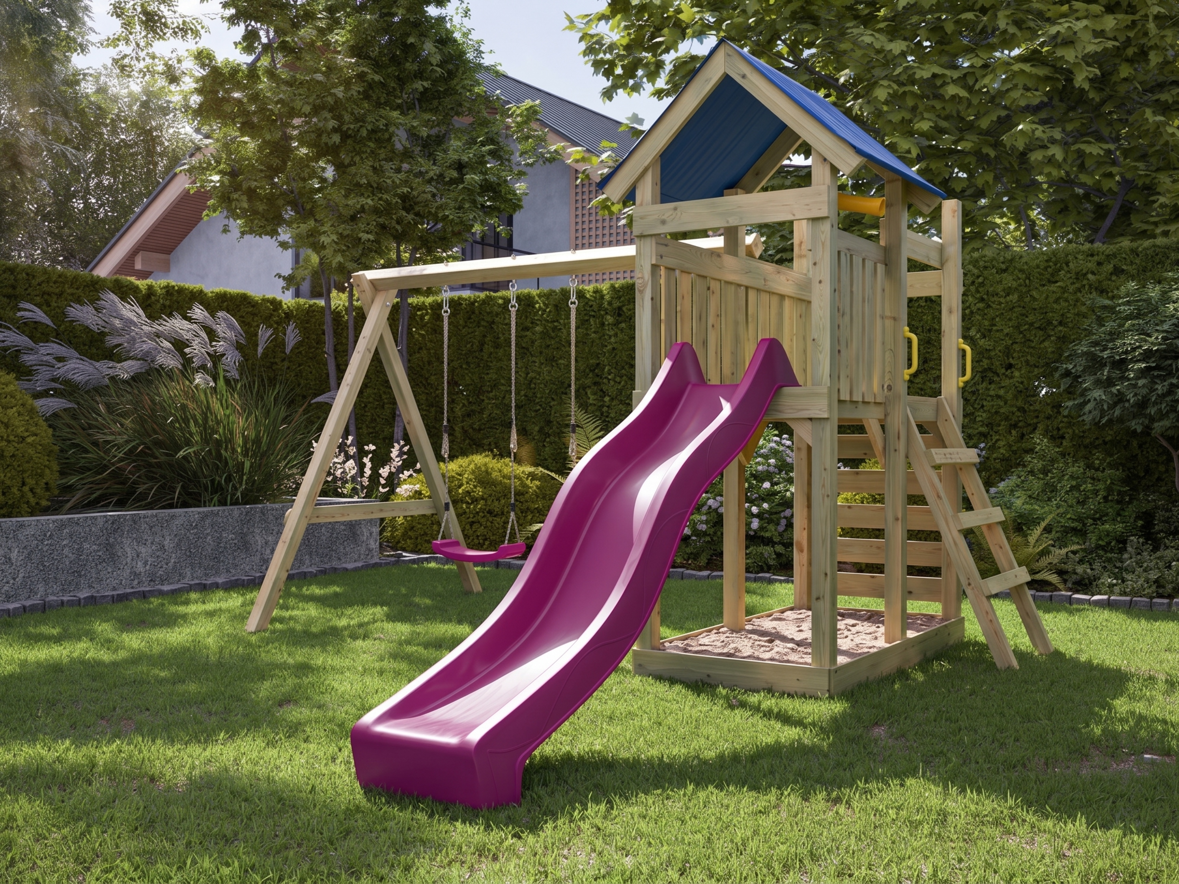- Portique double rose inclus, équipé d'une poutre de balançoire robuste de 9 x 9 cm.