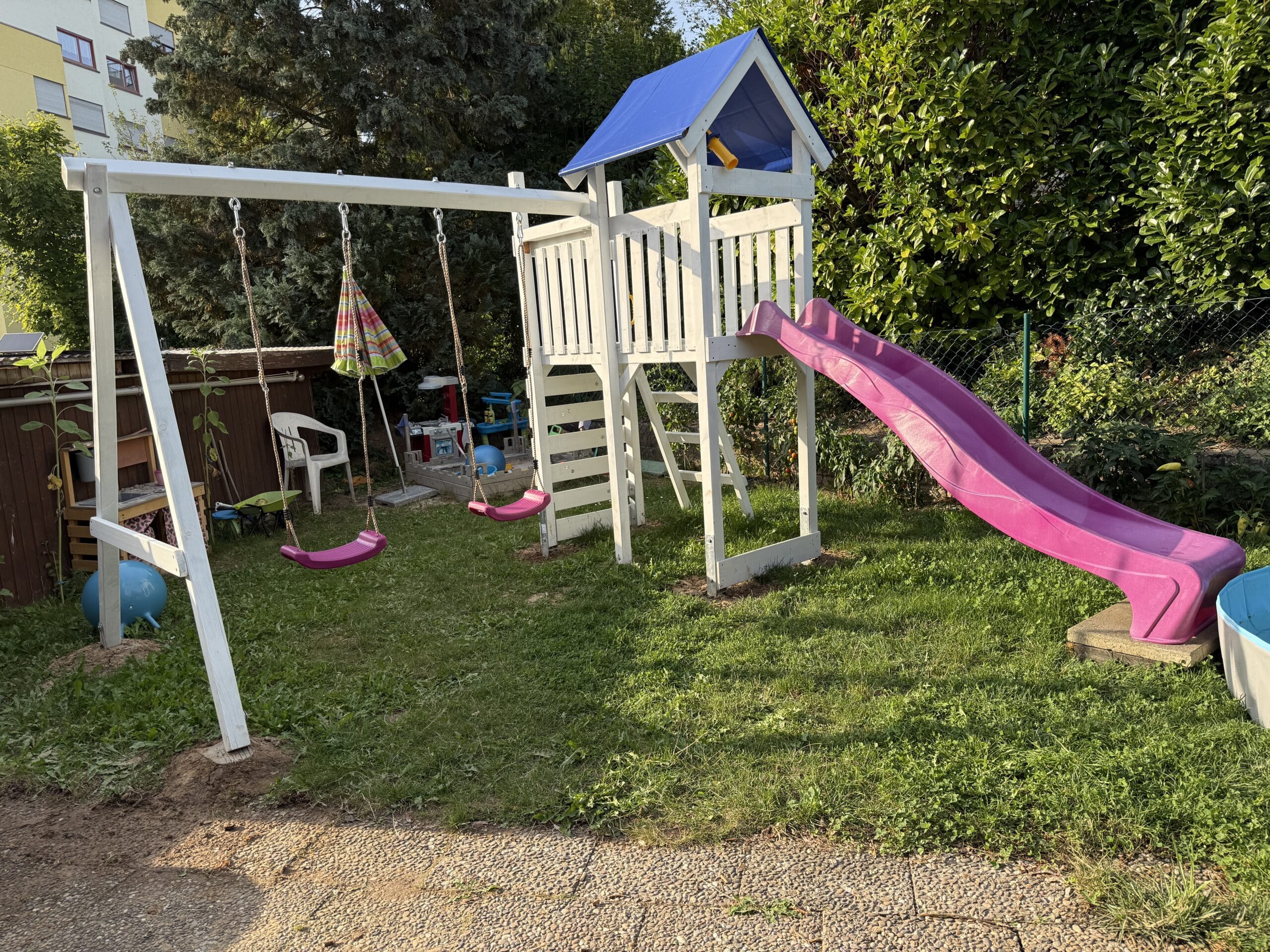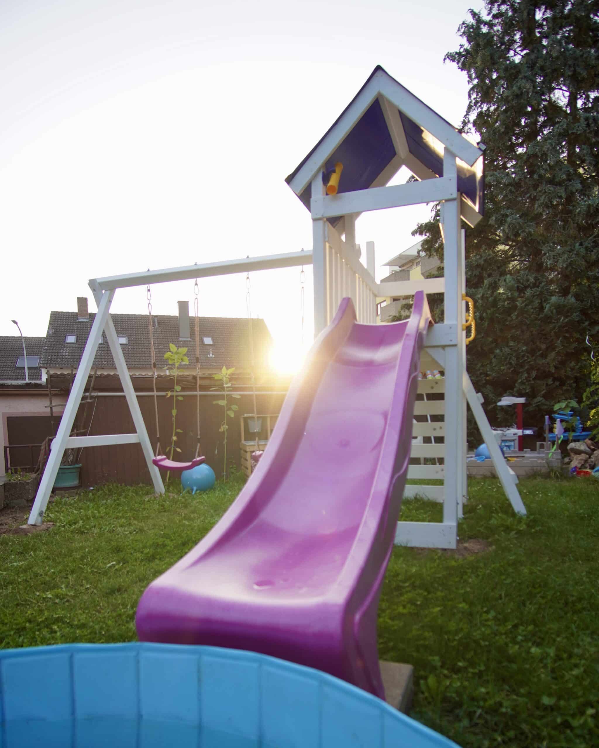 - toboggan à vague de 2,28 m inclus, facilement montable sur la plateforme. Le toboggan peut également être transformé en toboggan aquatique grâce à une connexion pour tuyau d'arrosage située sous le toboggan. Un simple perçage est nécessaire pour l'installation.
