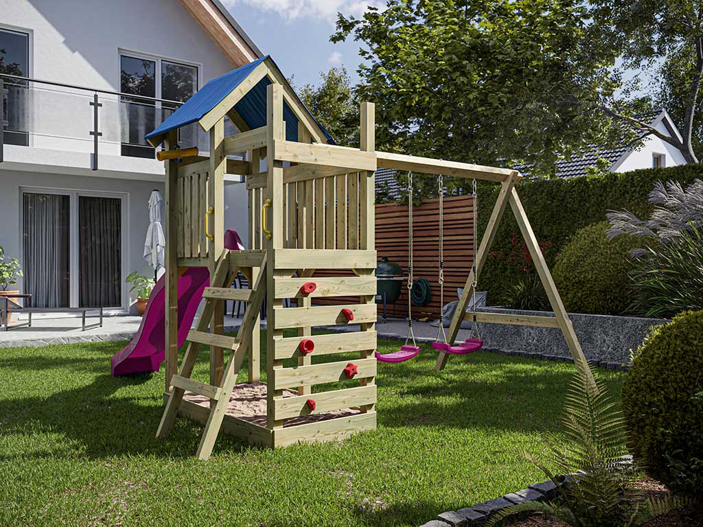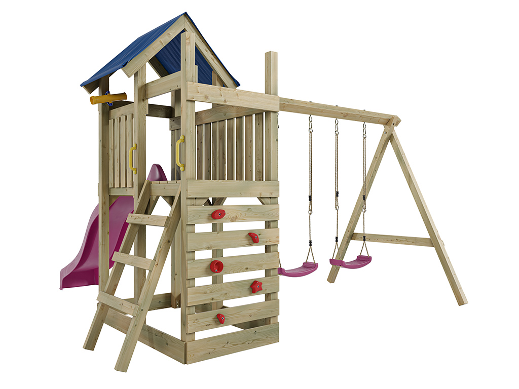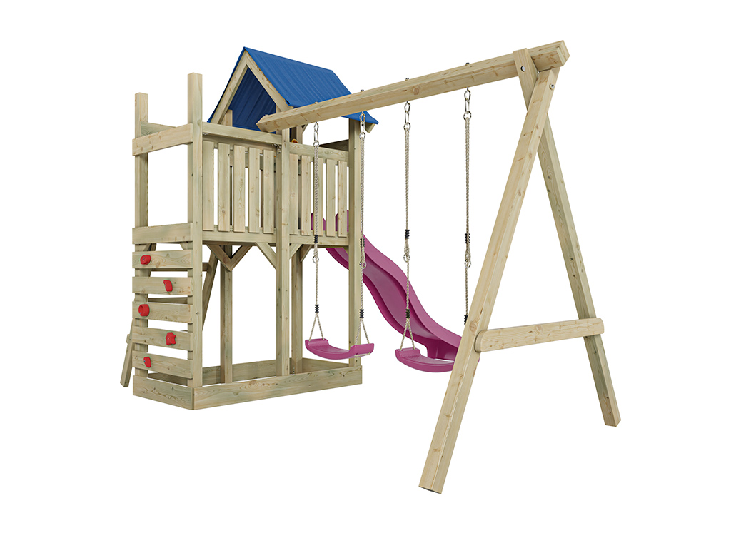 - Aire de jeux Speedy en bois autoclave avec toit en bâche, portique double, 2 sièges de balançoire ou 1 balançoire-nid (selon votre choix), 4 crochets pour balançoire, 2 poignées, bac à sable, échelle, mur d'escalade, prises d'escalade, 1 longue-vue et 1 toboggan.