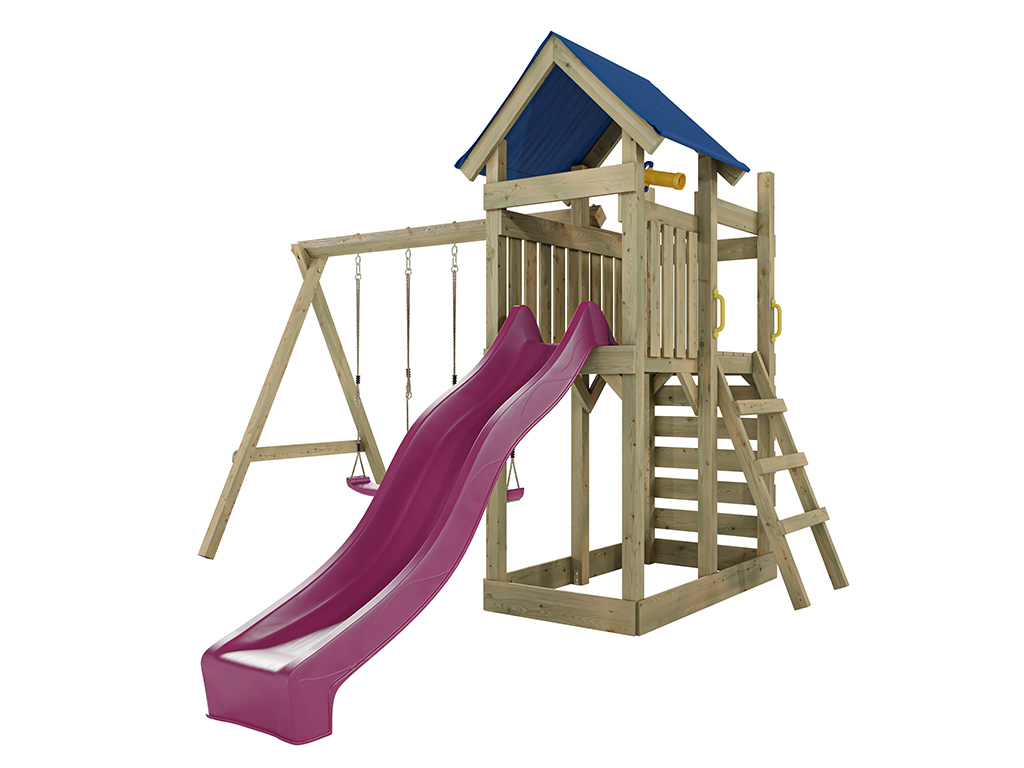 - toboggan à vague de 2,28 m inclus, facilement montable sur la plateforme. Le toboggan peut également être transformé en toboggan aquatique grâce à une connexion pour tuyau d'arrosage située sous le toboggan. Un simple perçage est nécessaire pour l'installation.