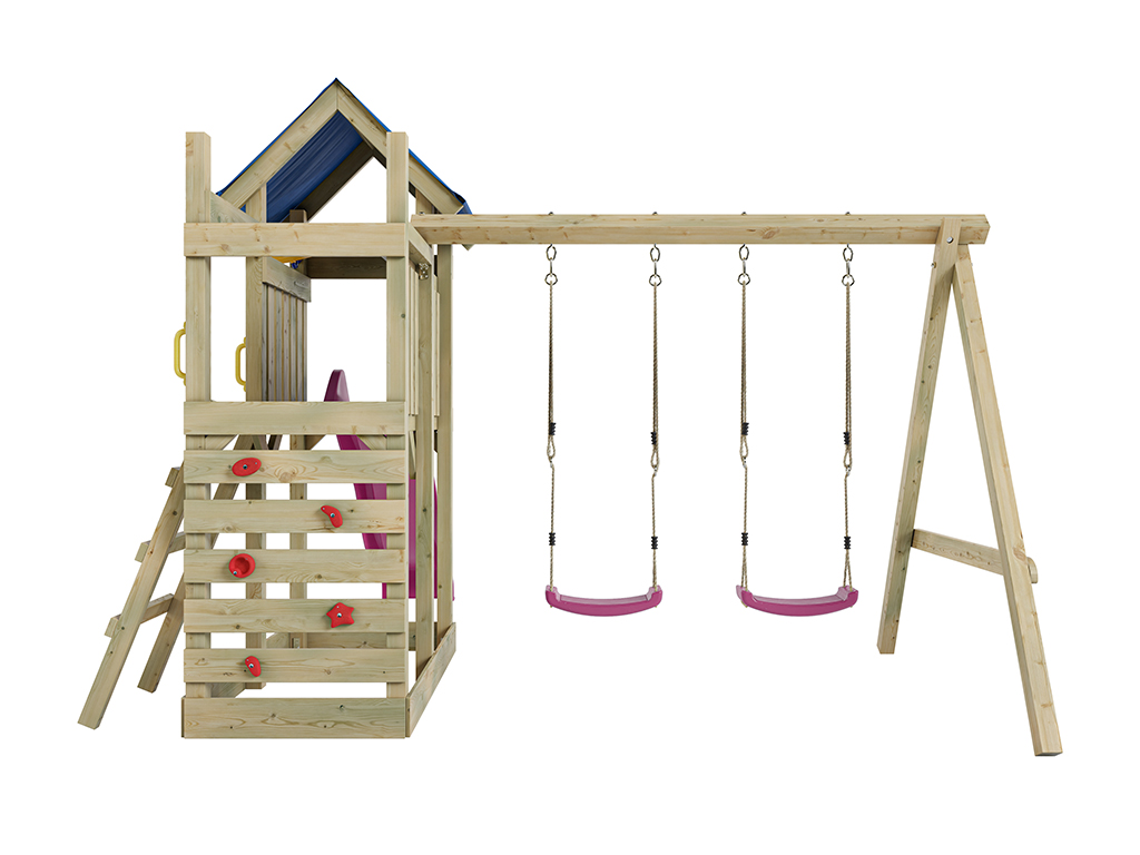 - Portique double rose inclus, équipé d'une poutre de balançoire robuste de 9 x 9 cm.