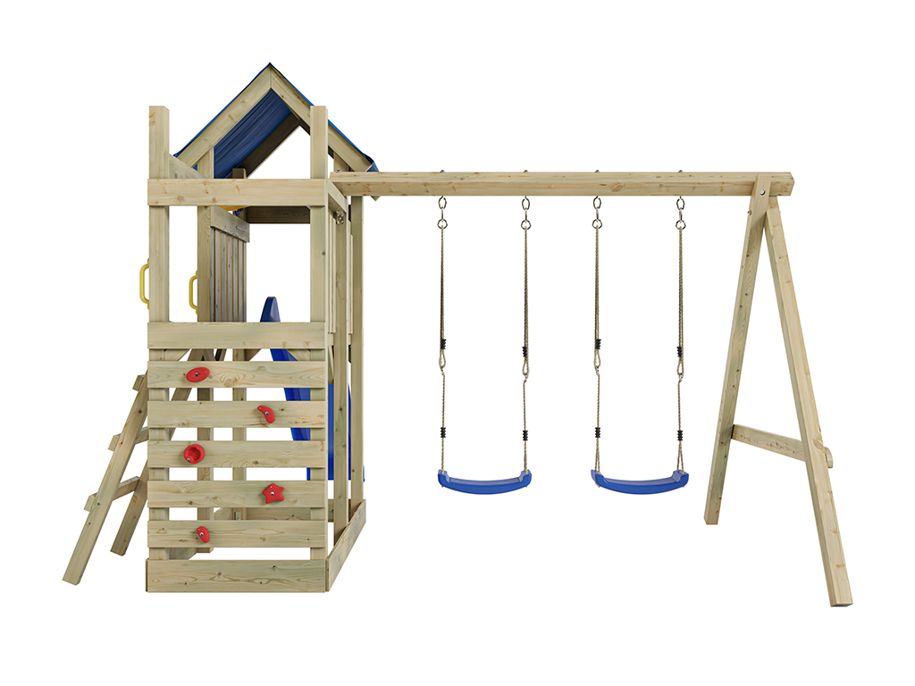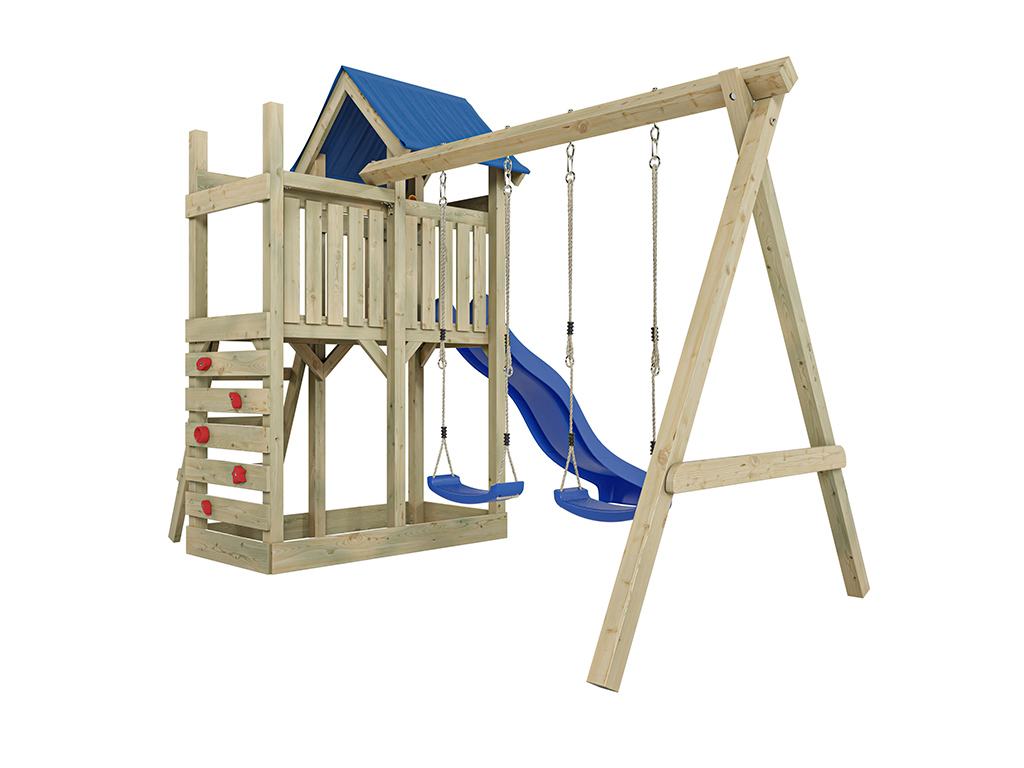 - Portique double en bleu inclus, avec une poutre de balançoire robuste de 9 x 9 cm.