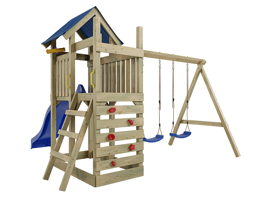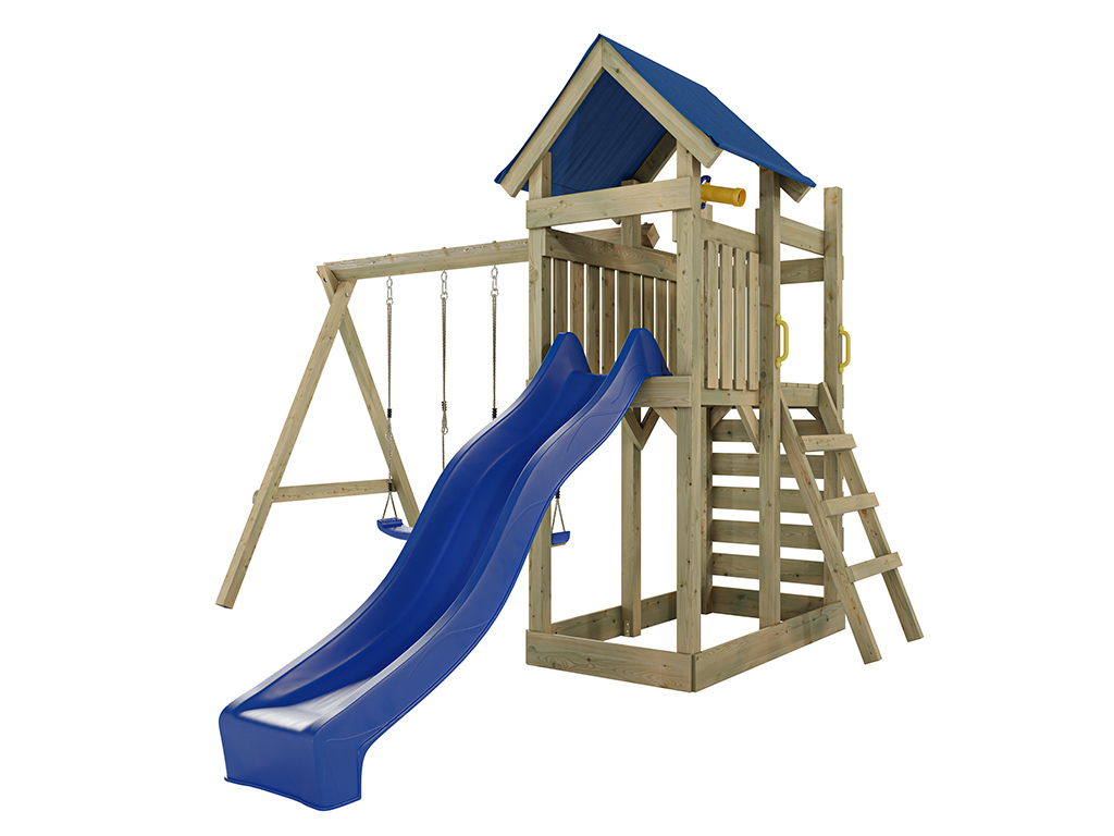 Aire de jeux Speedy en bois autoclave avec portique double, toboggan bleu et sièges bleus