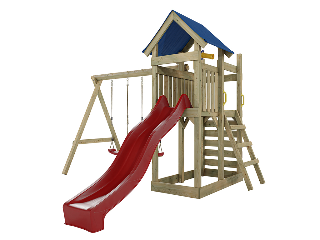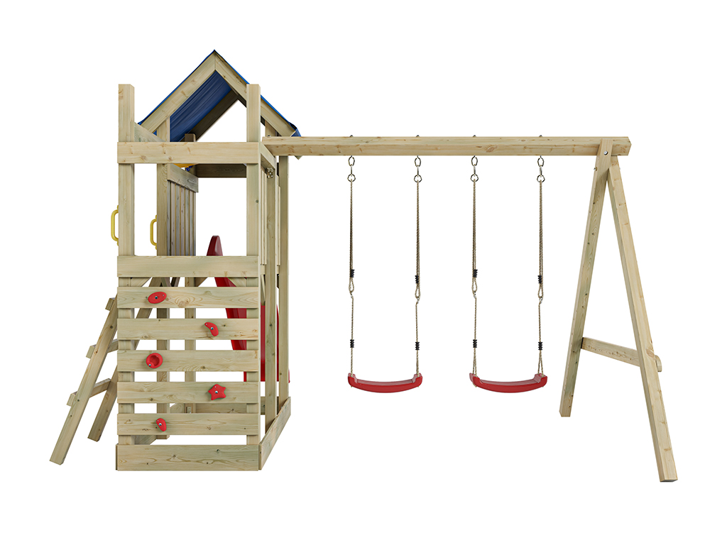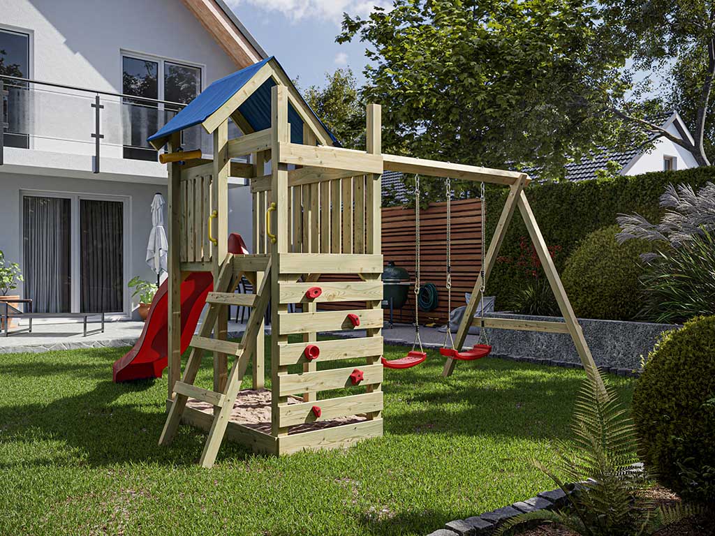 - Aire de jeux Speedy en bois autoclave, toit en bâche, portique double, 2x sièges de balançoire ou 1x balançoire nid (selon votre choix), 4 crochets pour balançoire, 2 poignées, bac à sable, échelle, mur d'escalade, prises d'escalade, 1x télescope, 1x toboggan