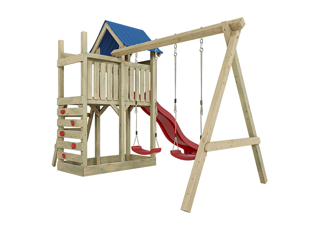 Aire de jeux Speedy en bois autoclave avec portique double, toboggan rouge et sièges rouges