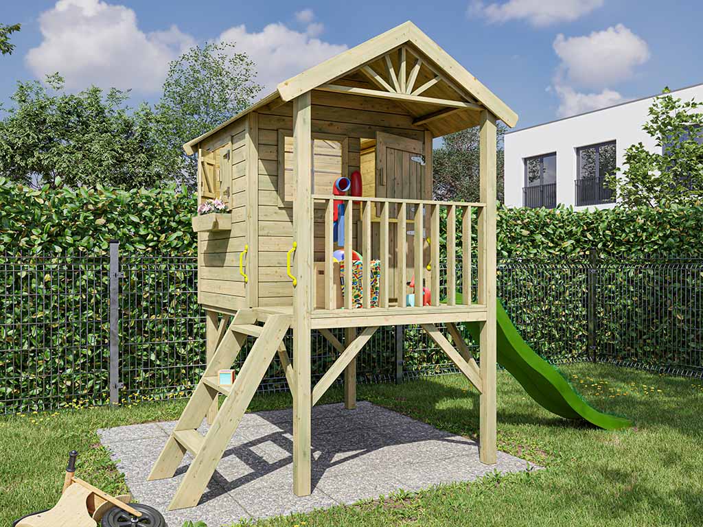 | Contenu de la livraison: | Maisonnette sur pilotis Funny XL, escalier, bac à fleurs, instructions de montage détaillées, volets, toboggan vert |