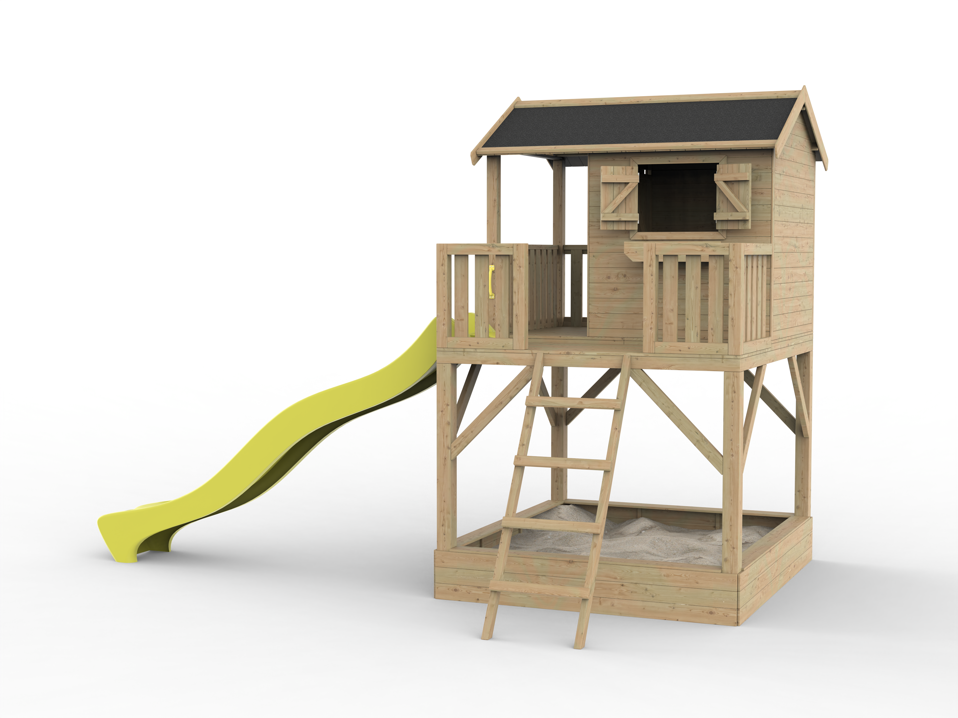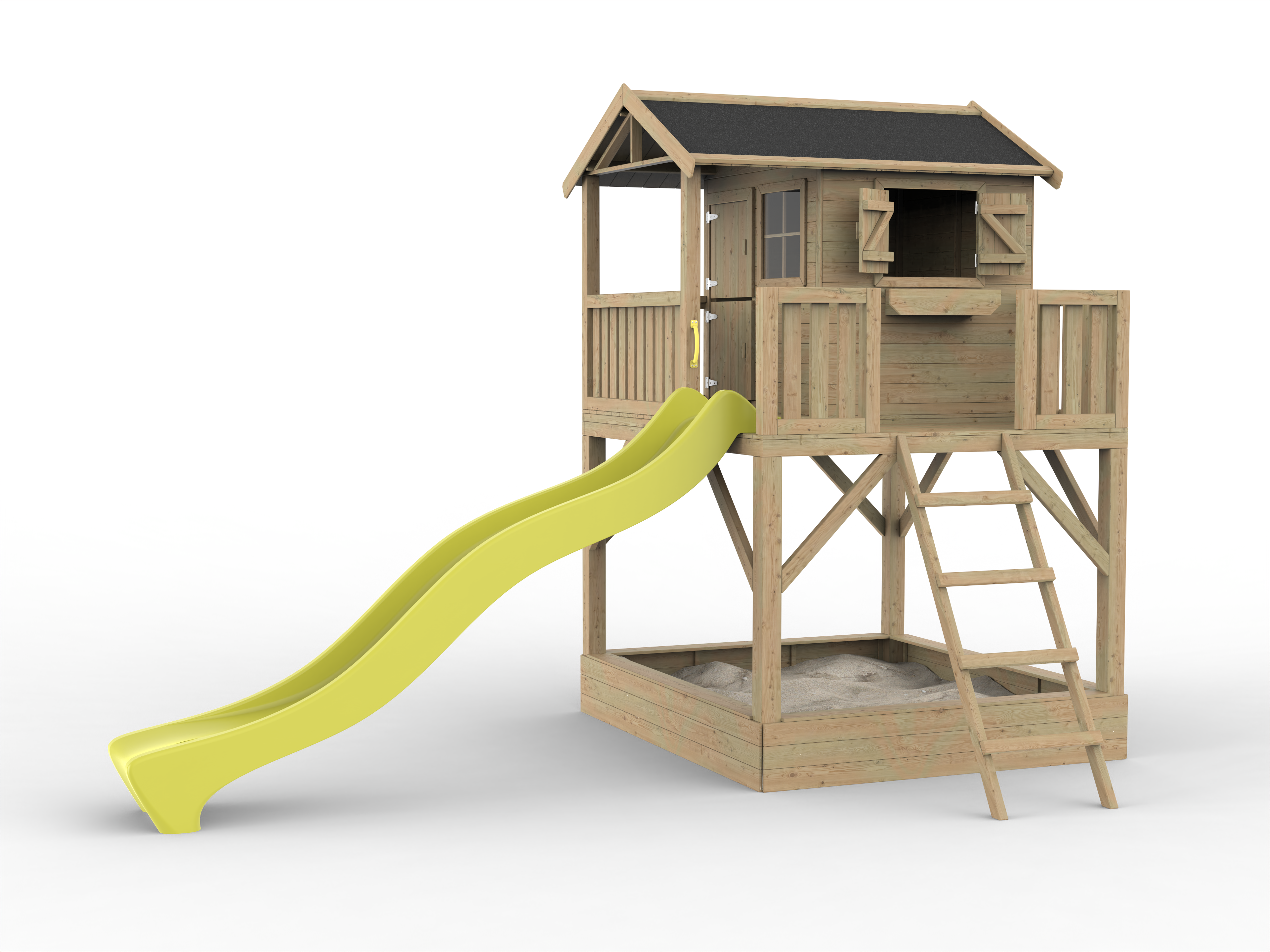 | Contenu de la livraison: | Maisonnette sur pilotis Funny XXL, bac à fleurs, volets, véranda, balcon, instructions de montage détaillées, toboggan jaune |
