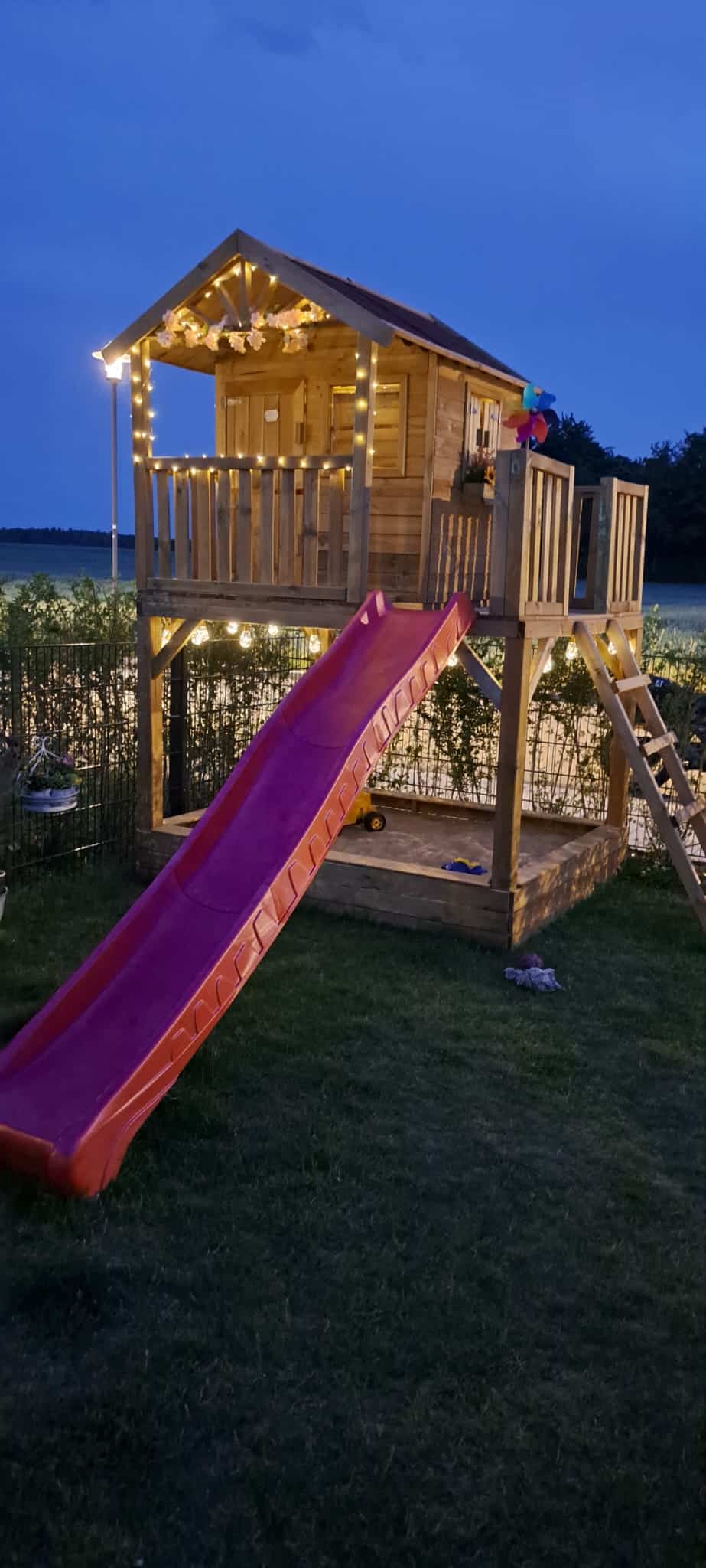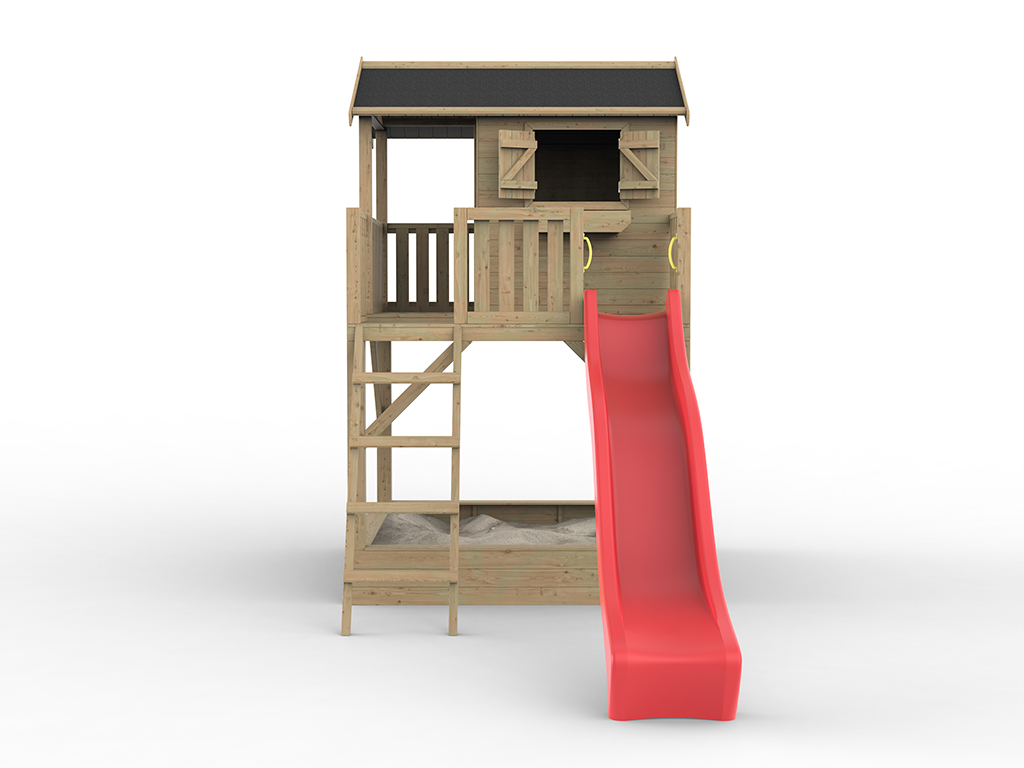 | Contenu de la livraison: | Maisonnette sur pilotis Funny XXL, bac à fleurs, volets, véranda, balcon, instructions de montage détaillées, toboggan rouge |