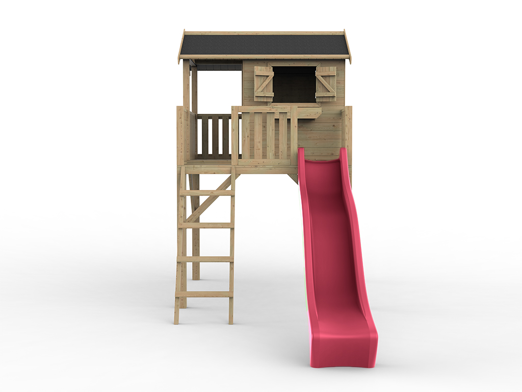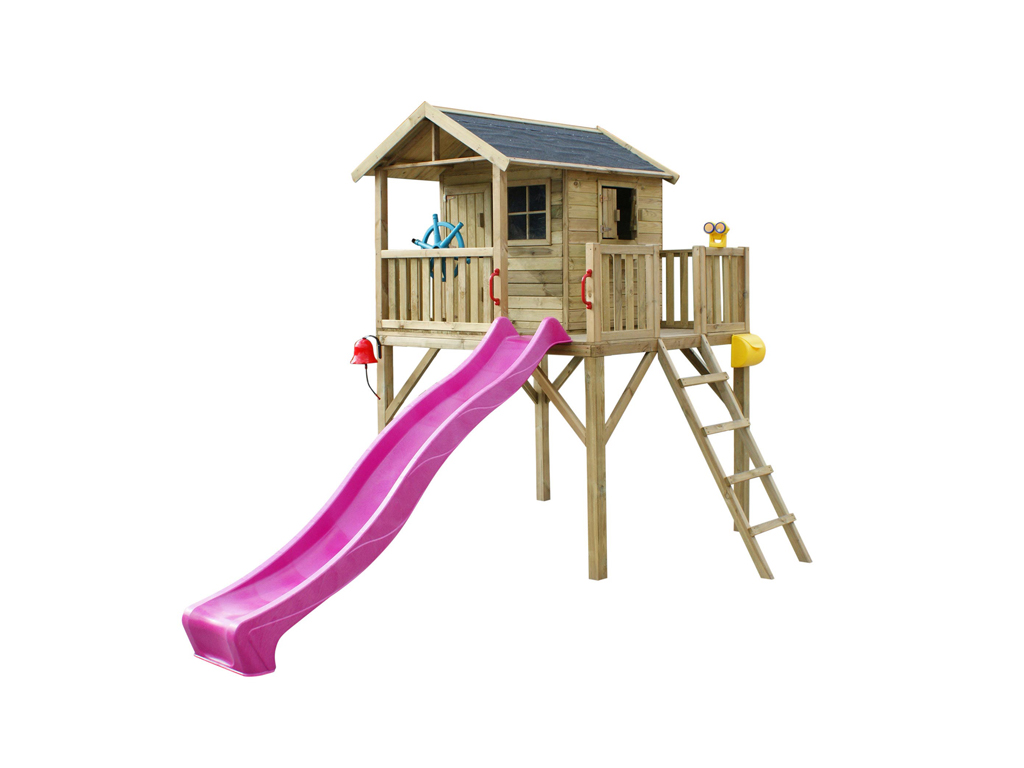 | Contenu de la livraison: | Maisonnette sur pilotis Funny XXL, bac à fleurs, volets, véranda, balcon, instructions de montage détaillées, toboggan violet |