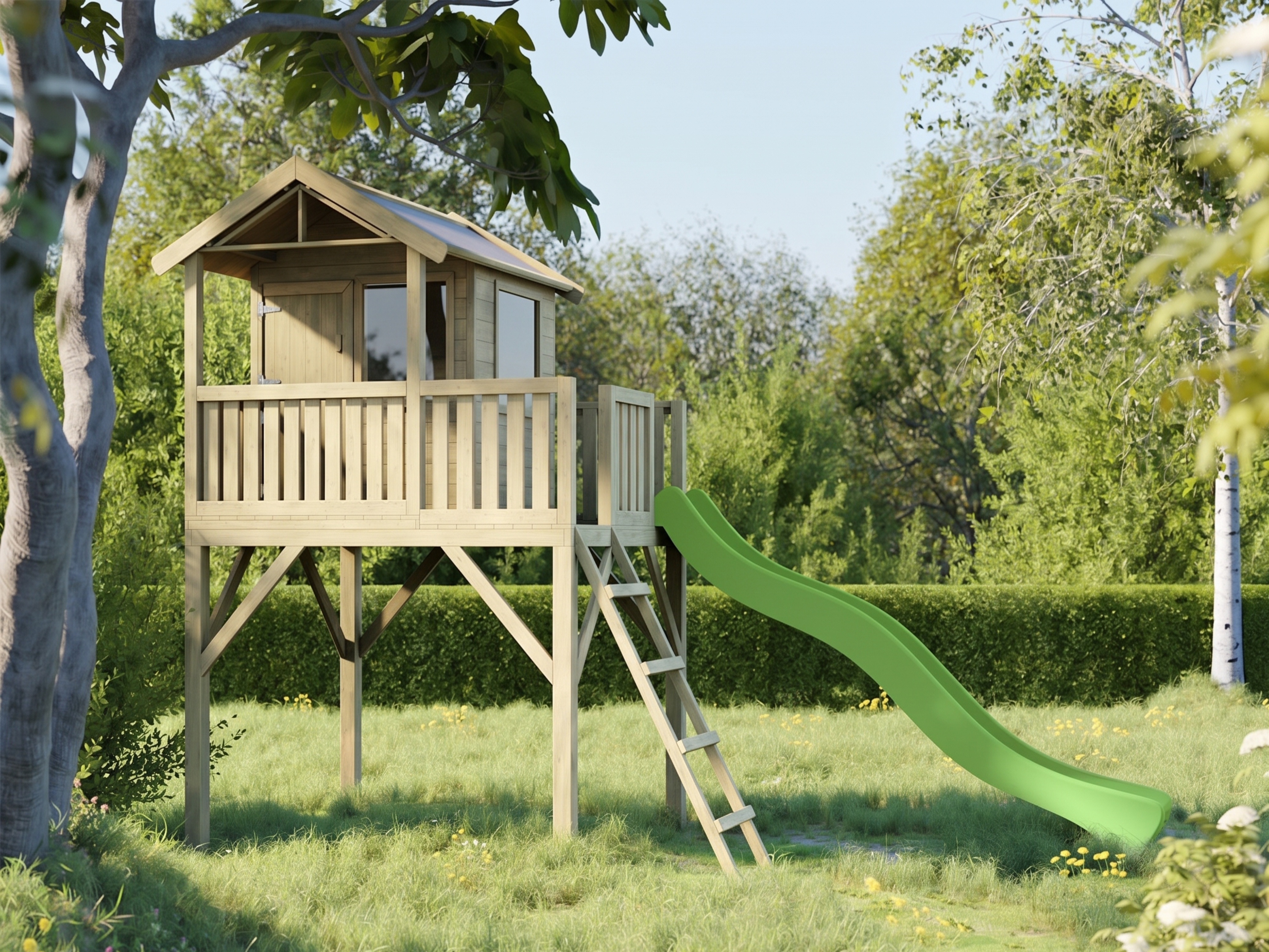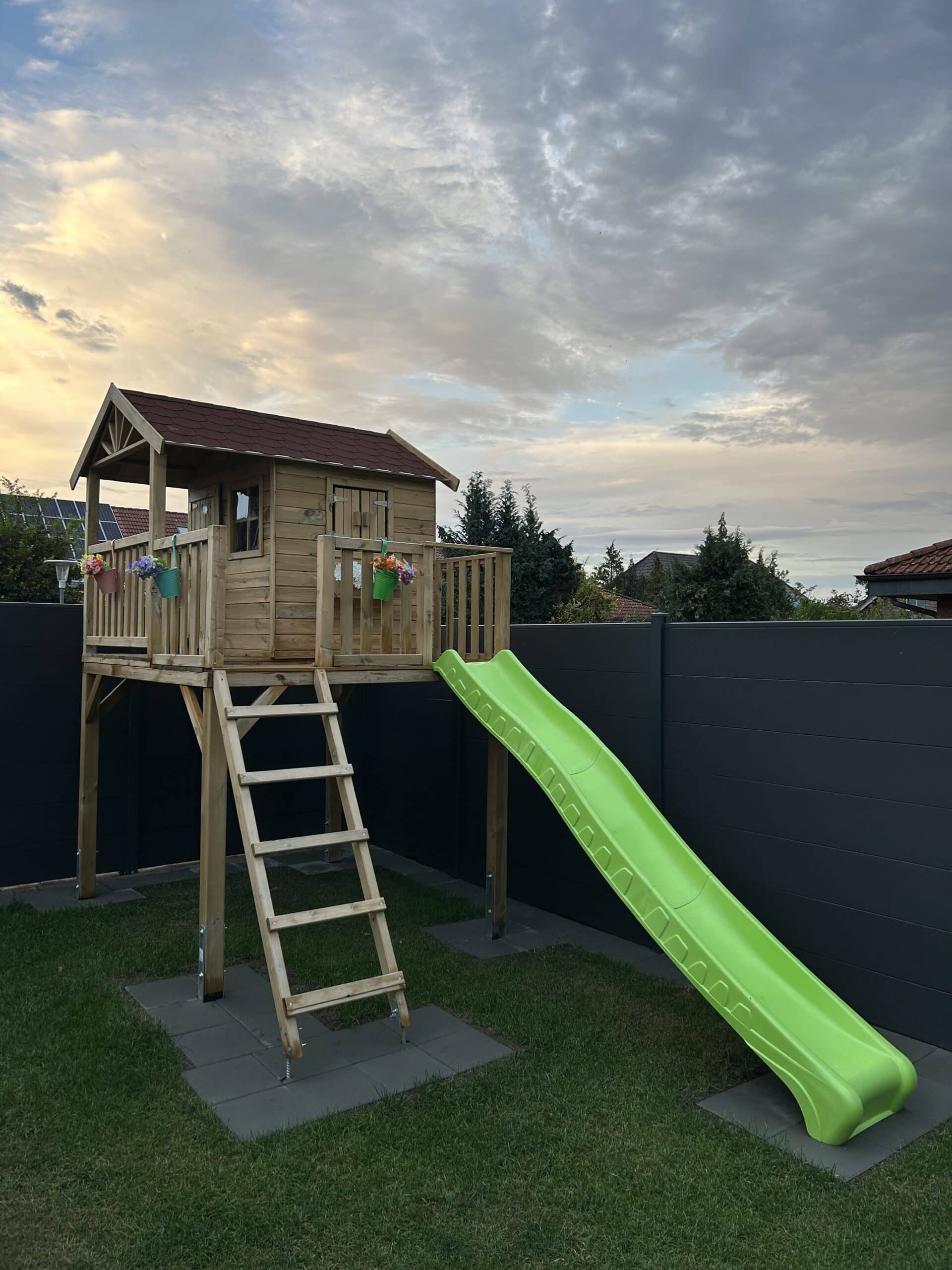 | Contenu de la livraison: | Maisonnette sur pilotis Funny XXL, bac à fleurs, volets, véranda, balcon, instructions de montage détaillées, toboggan vert |