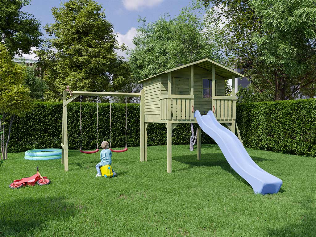 Grâce aux éléments prémontés et aux instructions de montage détaillées, la cabane de jardin sur pilotis est rapidement montée. Agrandissez la cabane de jardin sur pilotis avec l'extension de balançoire double correspondante. Consultez notre gamme d'accessoires à cet effet.