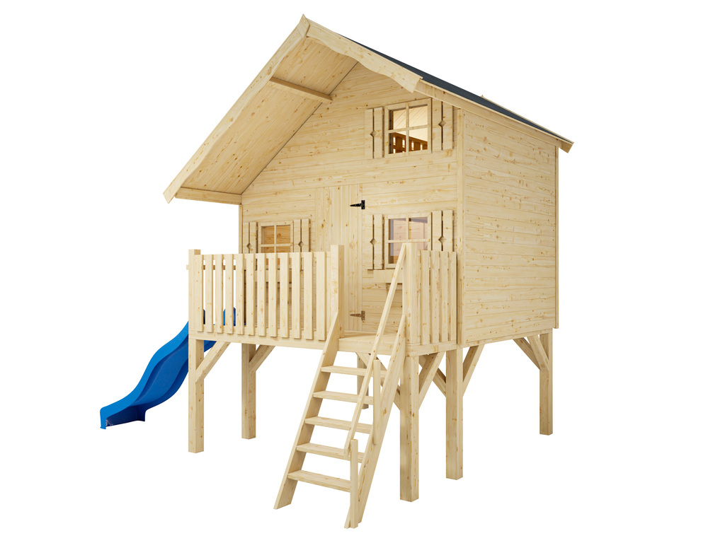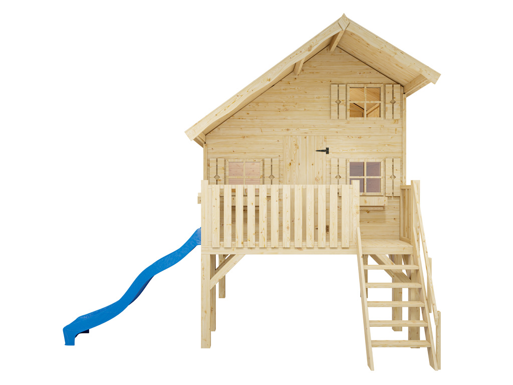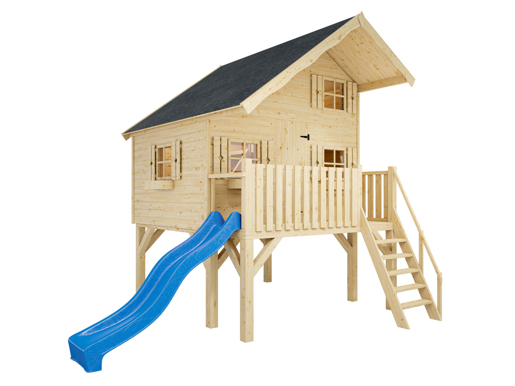 Cabane de jardin sur pilotis Tom XL 15 mm naturel incl. véranda, Échasses et toboggan bleu