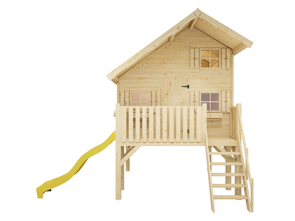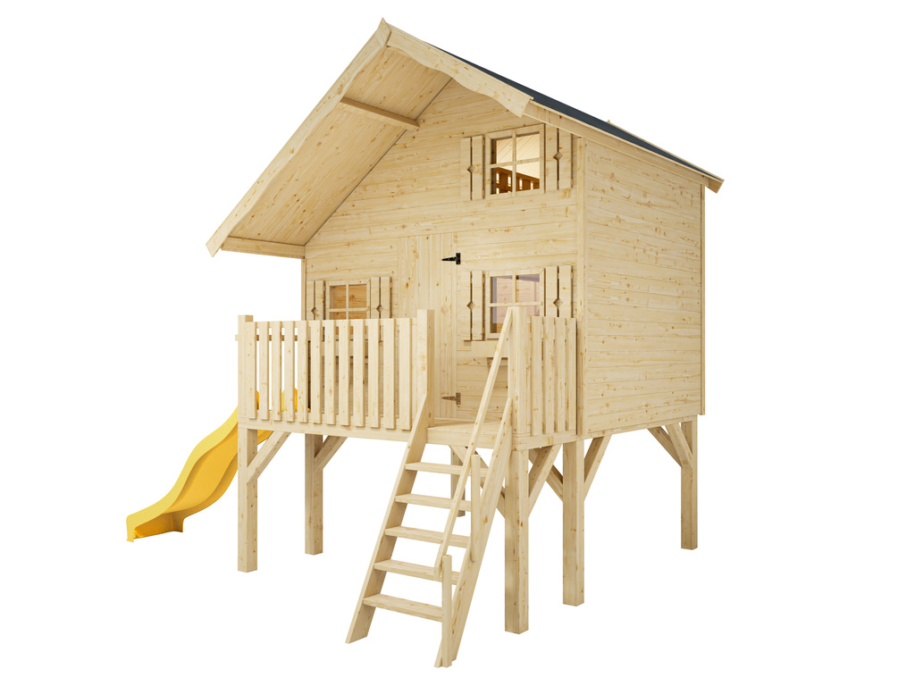 Cabane de jardin sur pilotis Tom XL 15 mm naturel incl. véranda, Échasses et toboggan jaune
