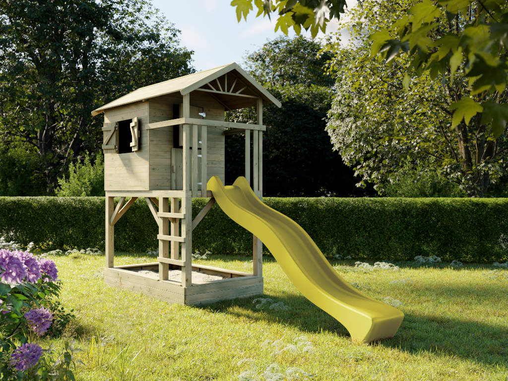 Cabane de jardin sur pilotis Tree Hut KDI avec bac à sable y compris toboggan jaune