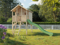 Cabane de jardin sur pilotis Tom XL 15 mm naturel incl. véranda, Échasses et toboggan vert Cabane de jardin sur pilotis Tom XL 15 mm...