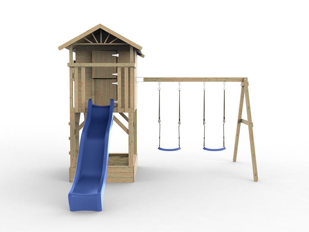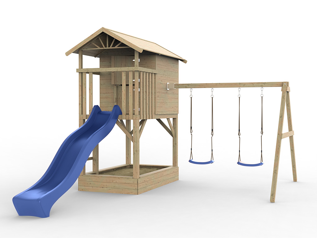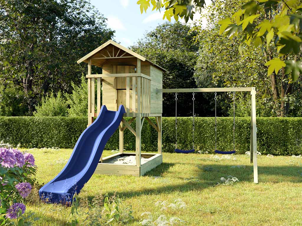 Cabane enfants sur pilotis Prestige Garden « Tree Hut avec bac à sable » traitée par autoclave avec balançoire double et glissière de toboggan bleue