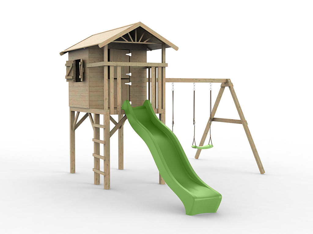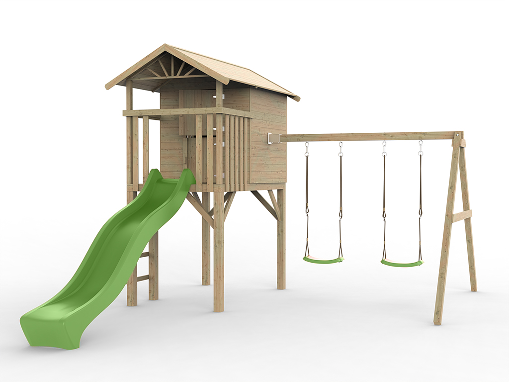 Cabane enfants sur pilotis Prestige Garden "Tree Hut" imprégnée en autoclave, avec portique pour 2 balançoires intégré et toboggan à vagues vert