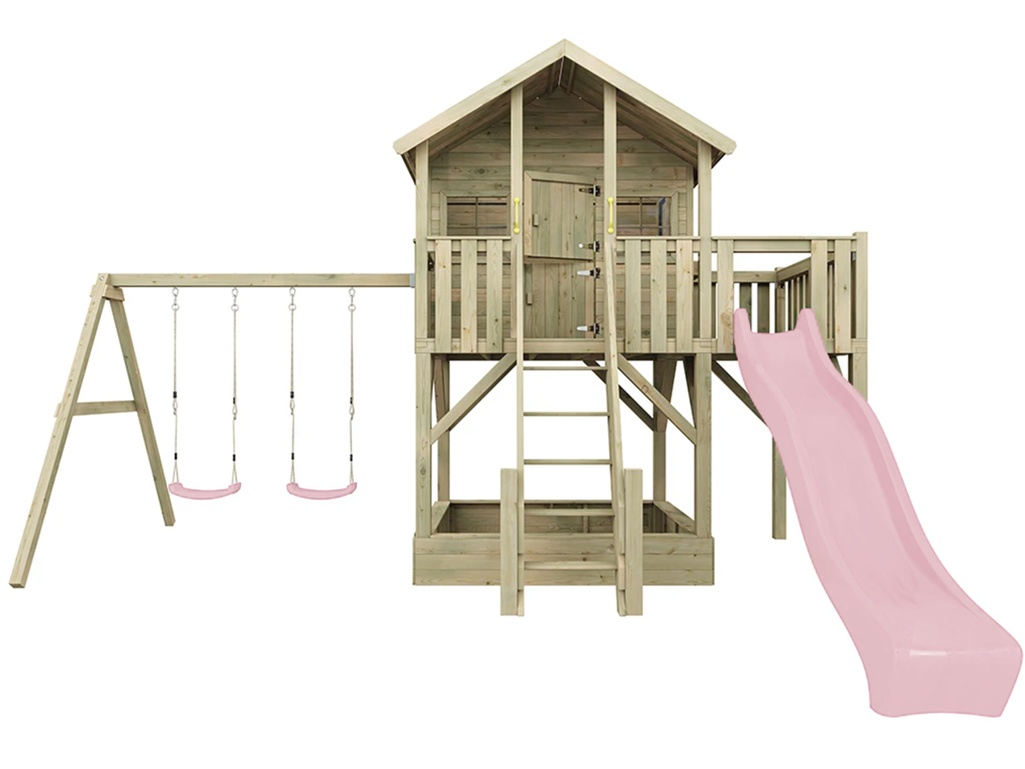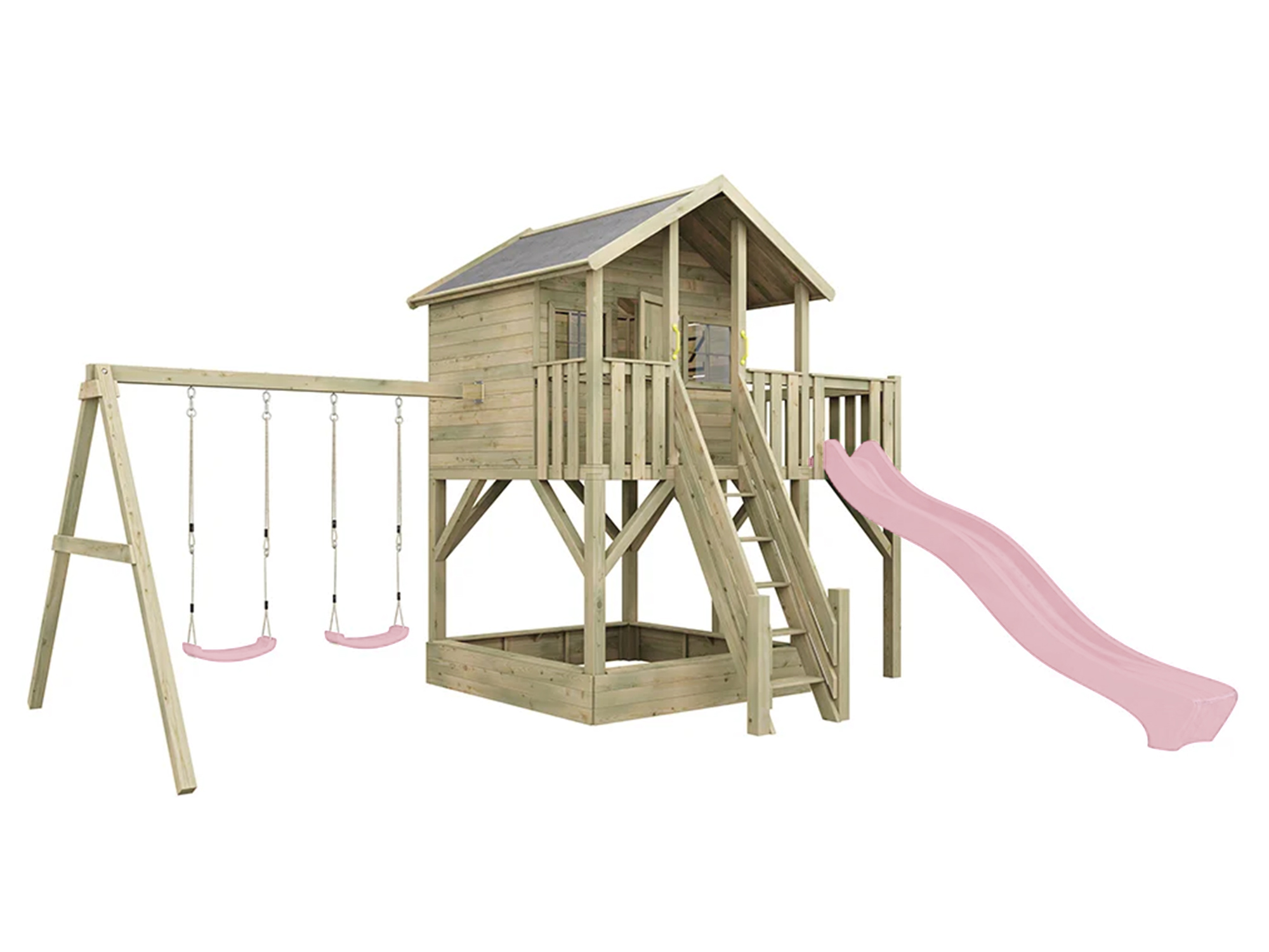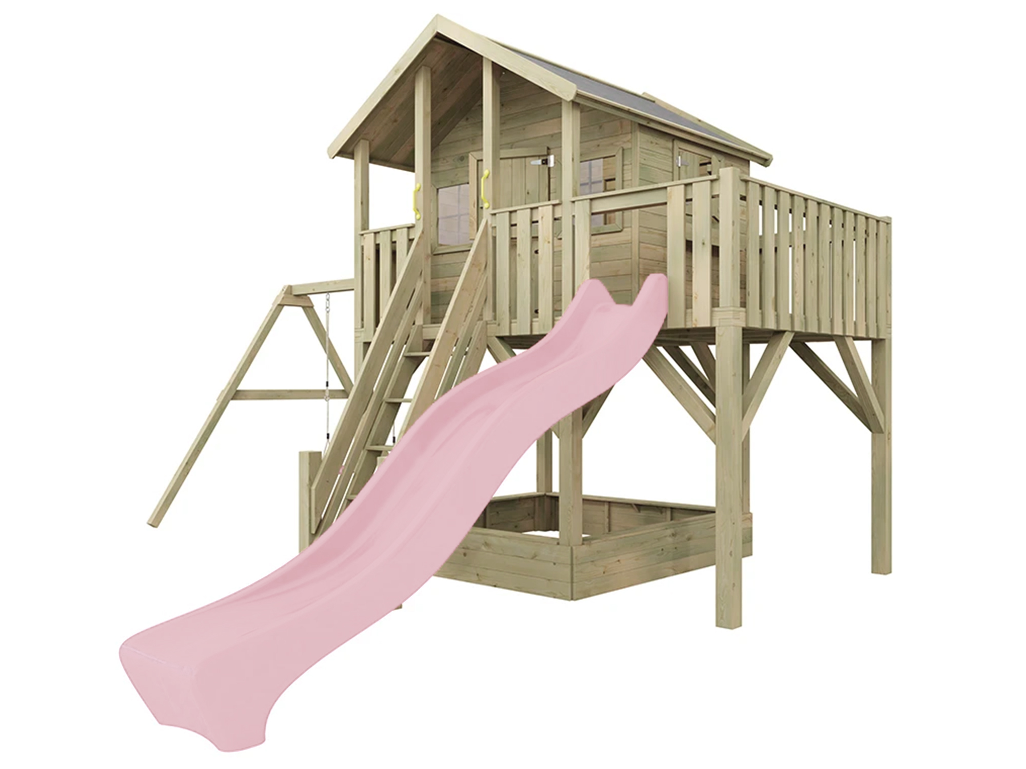 Cabane sur pilotis en bois autoclave “Big House XL” avec portique double et toboggan rose-pastel...plus