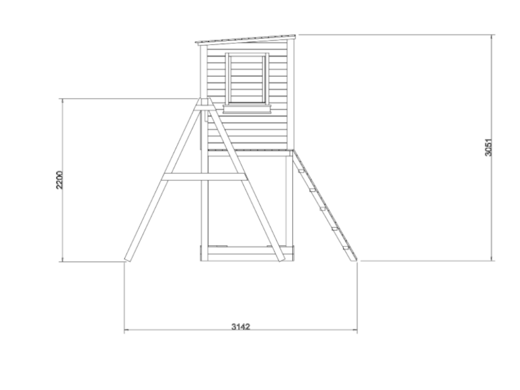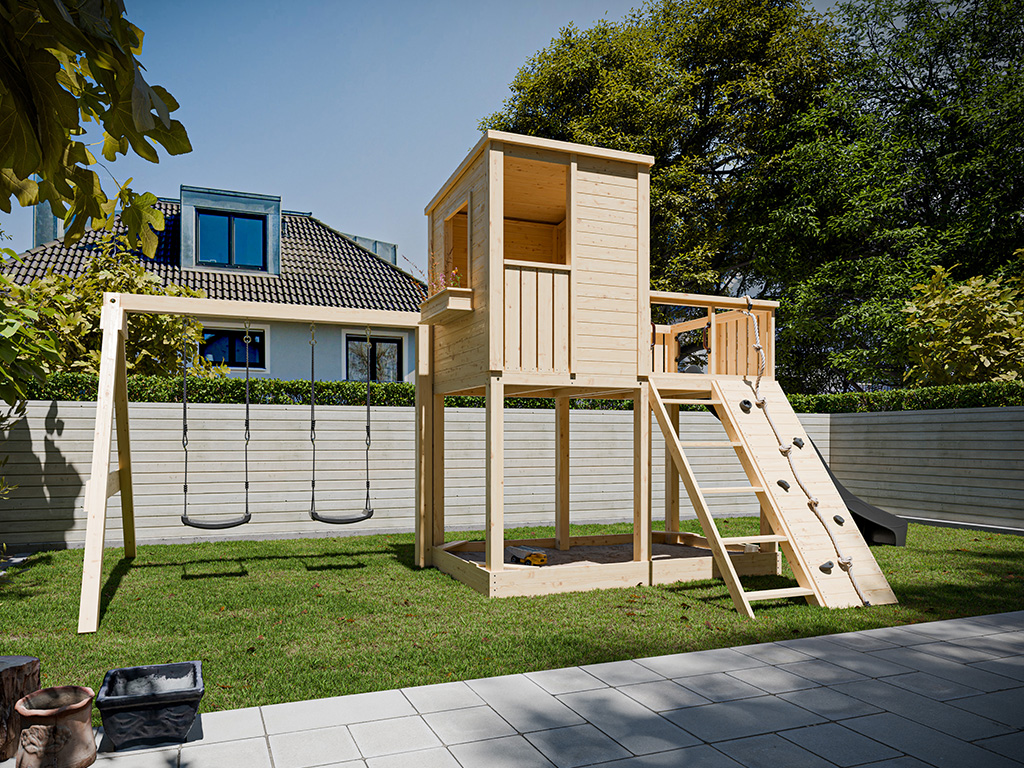 Cette cabane sur pilotis est un lieu d'aventures passionnant – la plateforme surélevée, à l'image d'une cabane dans les arbres, est facilement accessible. L'épaisseur des parois de 14 mm garantit une grande stabilité.