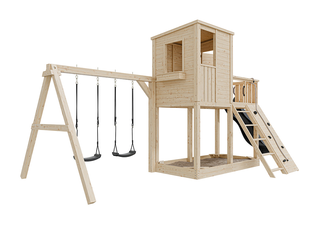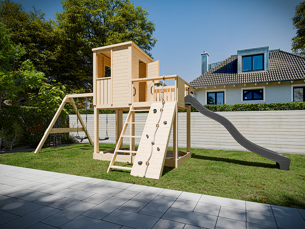 - 1 cabane sur pilotis Carl avec portique double ; 1 corde, 5 prises d'escalade (anthracite), 4 poignées (anthracite), 2 sièges de balançoire (anthracite), 1 toboggan (anthracite), 1 escalier, 1 mur d'escalade et 1 jardinière