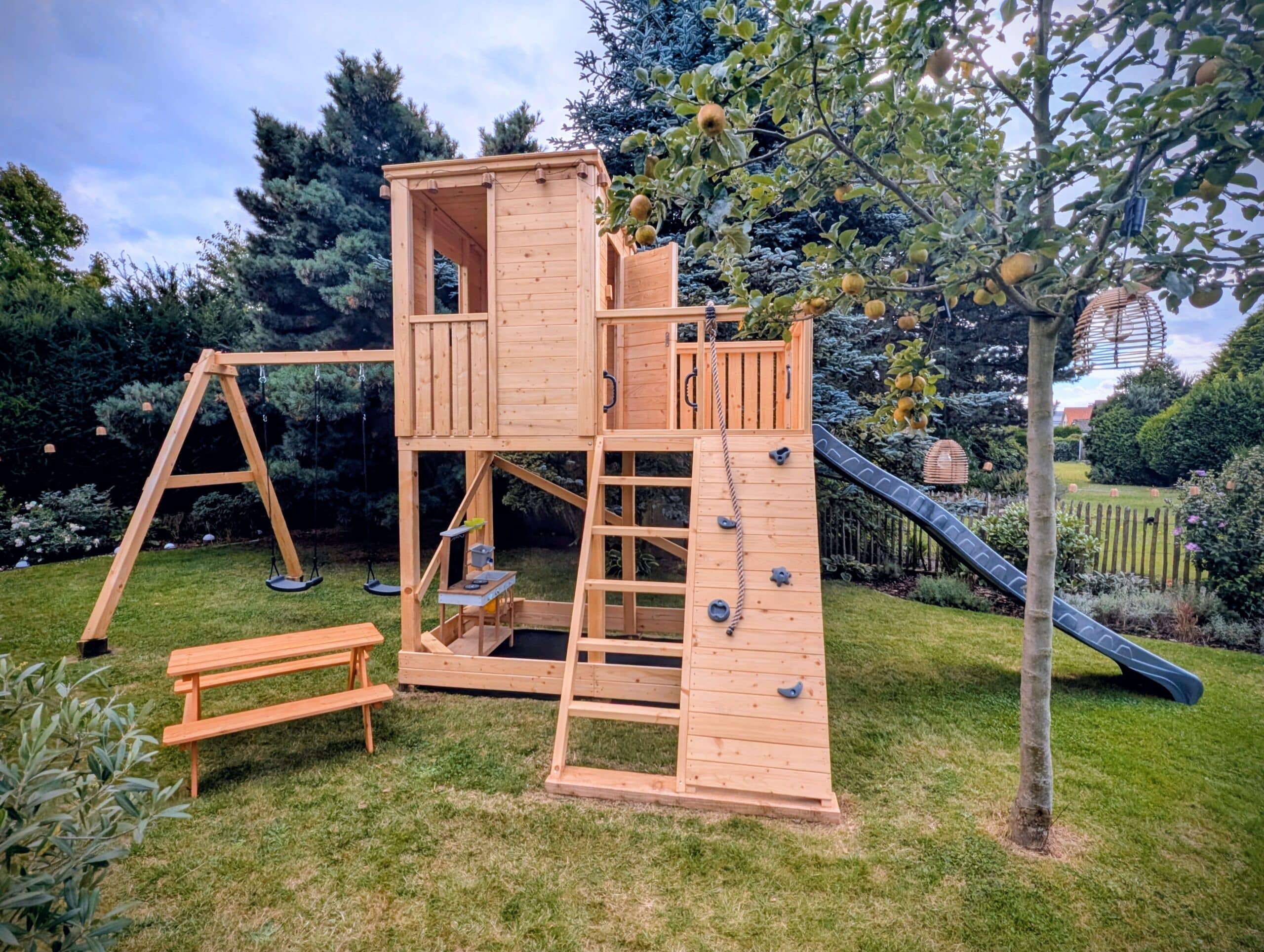 Cette aire de jeux est fabriquée en bois, un matériau naturel idéal pour les équipements de jeux pour enfants – résistant et durable. Pour sa fabrication, un bois d'épicéa de première qualité a été utilisé. L'épicéa est particulièrement robuste et assure la stabilité nécessaire. Le bois est brut et non traité, exempt de toute imprégnation chimique, ce qui le rend totalement sûr pour les enfants. Afin de garantir la durabilité et la résistance aux intempéries du bois, nous recommandons un traitement avec un produit de protection pour bois, tel qu'un vernis ou une lasure. Le bois brut est également parfait pour être peint dans des couleurs vives.