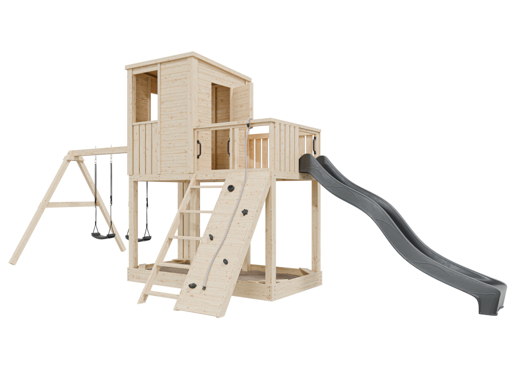 Matériau : bois, L x P x H env. 480 x 210 x 305 cm, avec toboggan et sièges de balançoire anthracite, mur d'escalade avec corde et prises d'escalade anthracite