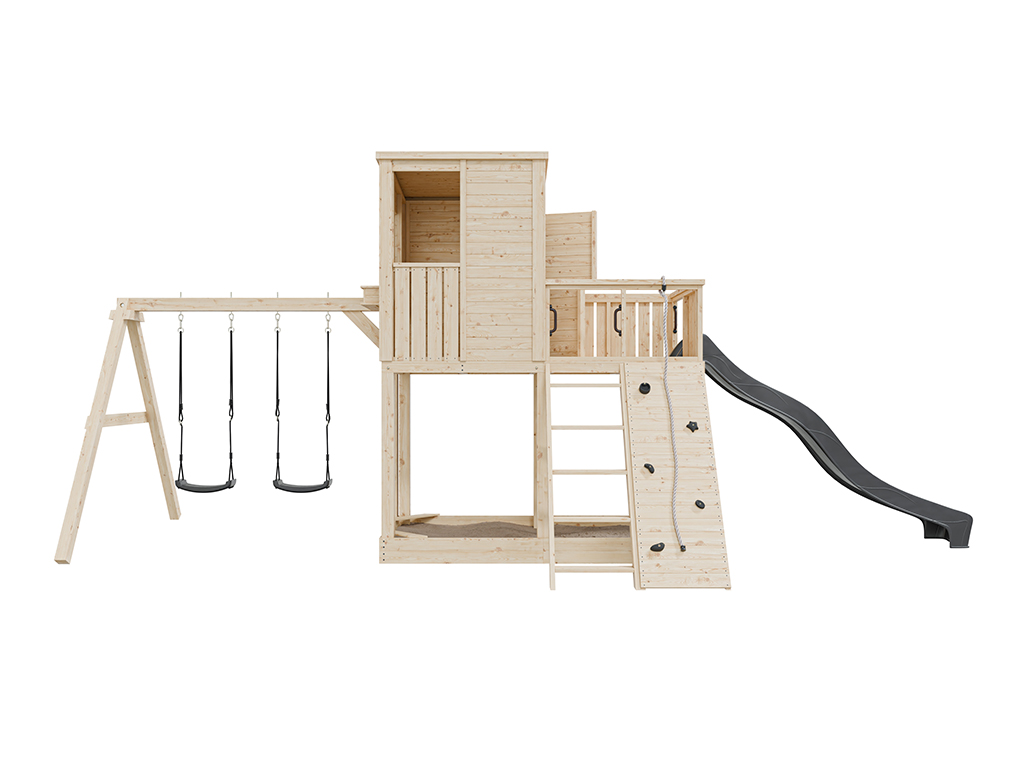 Matériau : bois, L x P x H env. 480 x 210 x 305 cm, avec toboggan et sièges de balançoire anthracite, mur d'escalade avec corde et prises d'escalade anthracite