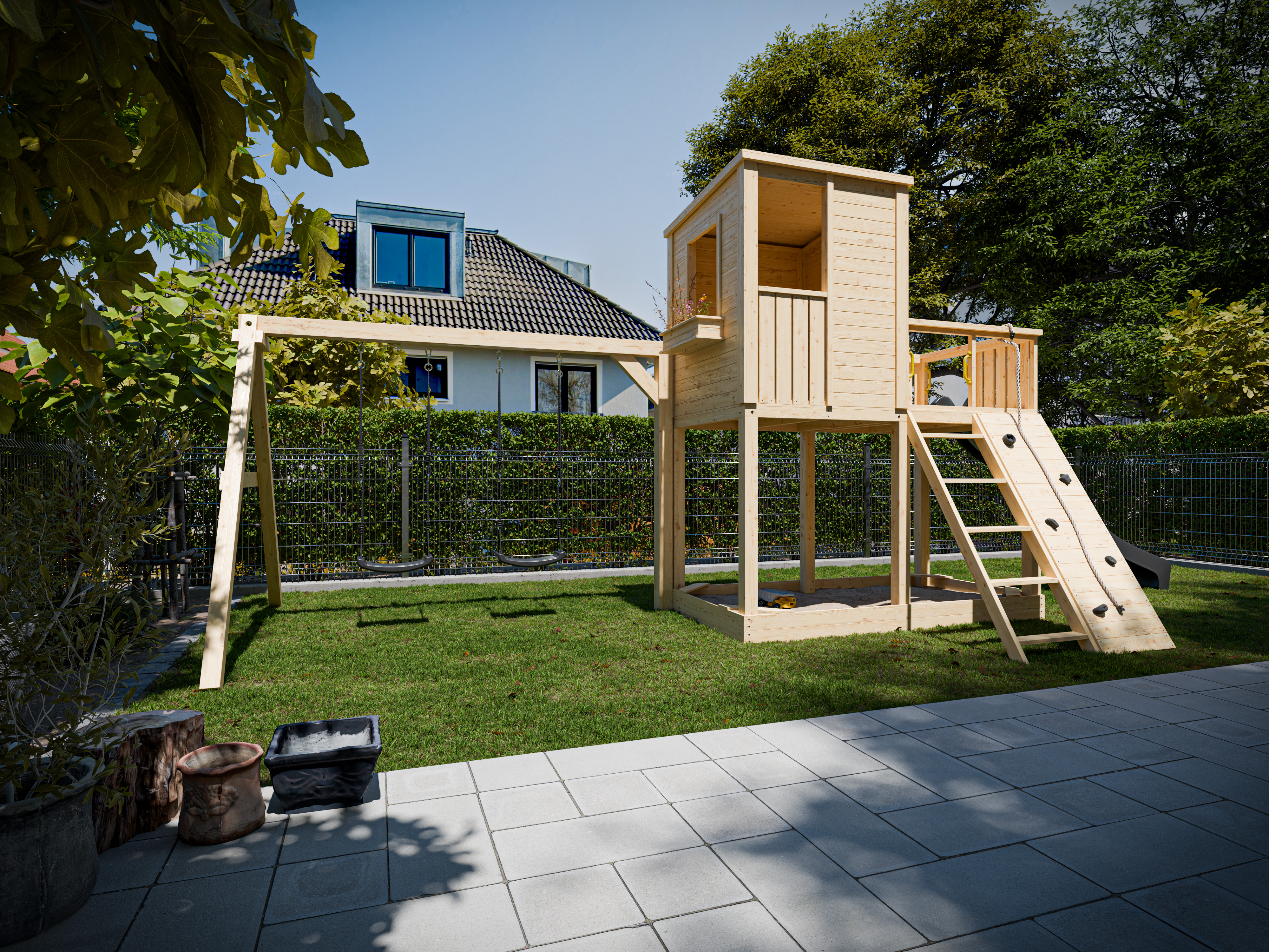 Cette aire de jeux est fabriquée en bois, un matériau naturel idéal pour les équipements de jeux pour enfants – résistant et durable. Pour sa fabrication, un bois d'épicéa de première qualité a été utilisé. L'épicéa est particulièrement robuste et assure la stabilité nécessaire. Le bois est brut et non traité, exempt de toute imprégnation chimique, ce qui le rend totalement sûr pour les enfants. Afin de garantir la durabilité et la résistance aux intempéries du bois, nous recommandons un traitement avec un produit de protection pour bois, tel qu'un vernis ou une lasure. Le bois brut est également parfait pour être peint dans des couleurs vives.