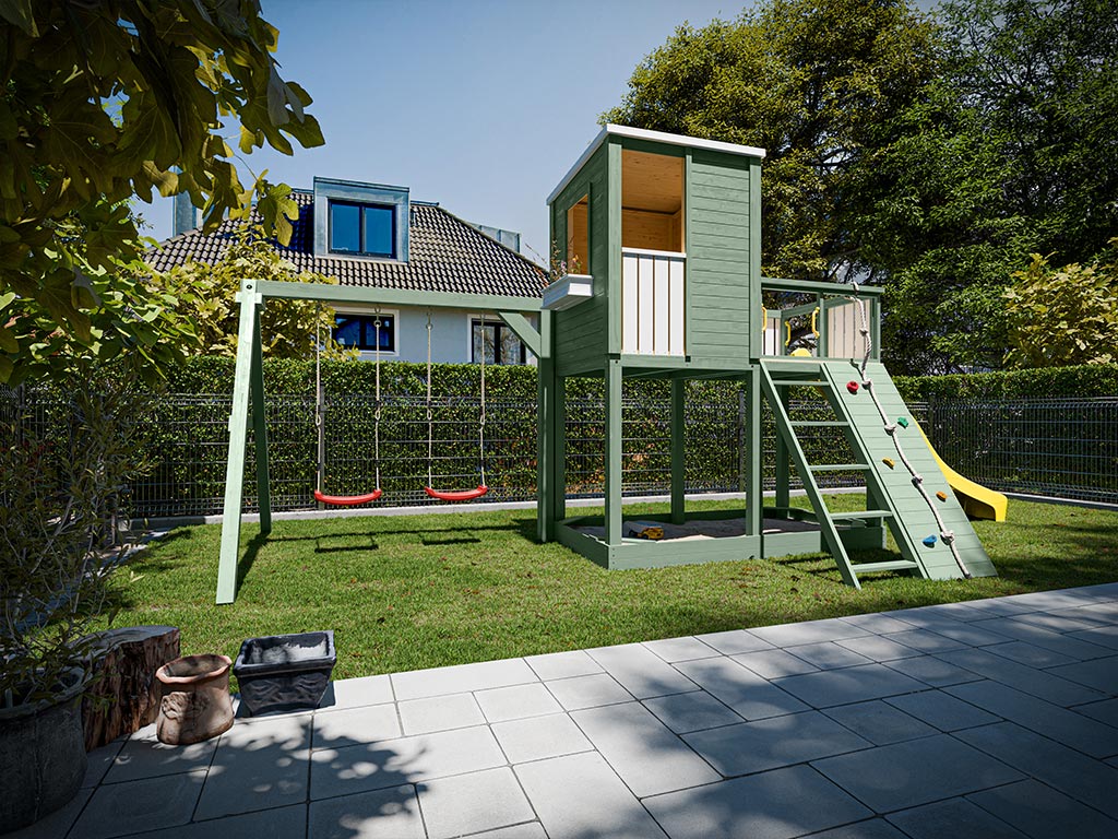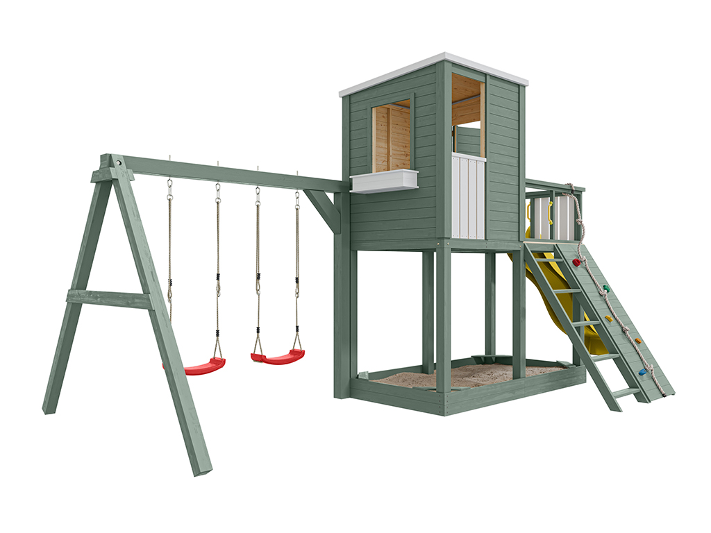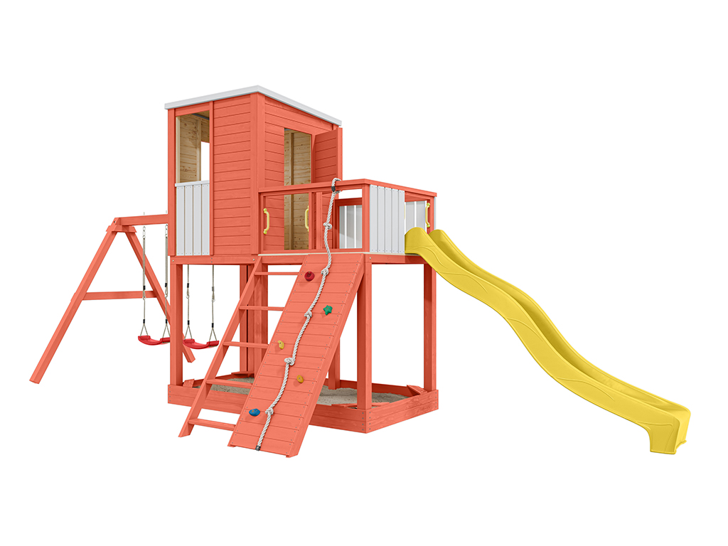 - 1 cabane sur pilotis Carl avec portique double; 1 corde, 5 prises d'escalade (colorées), 4 poignées (jaunes), 2 sièges de balançoire (rouges). 1 toboggan (jaune), 1 escalier, 1 mur d'escalade et 1 jardinière
