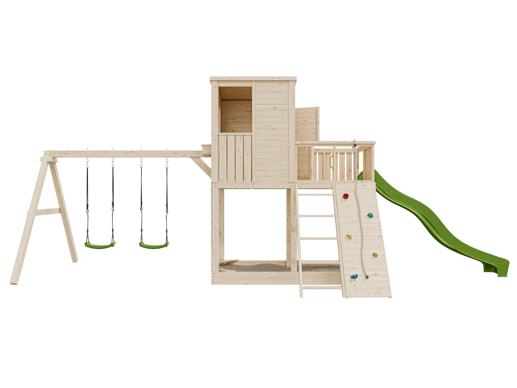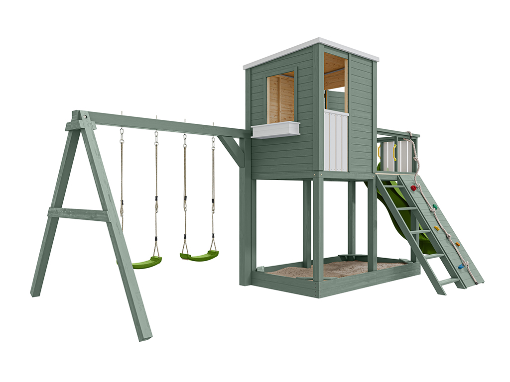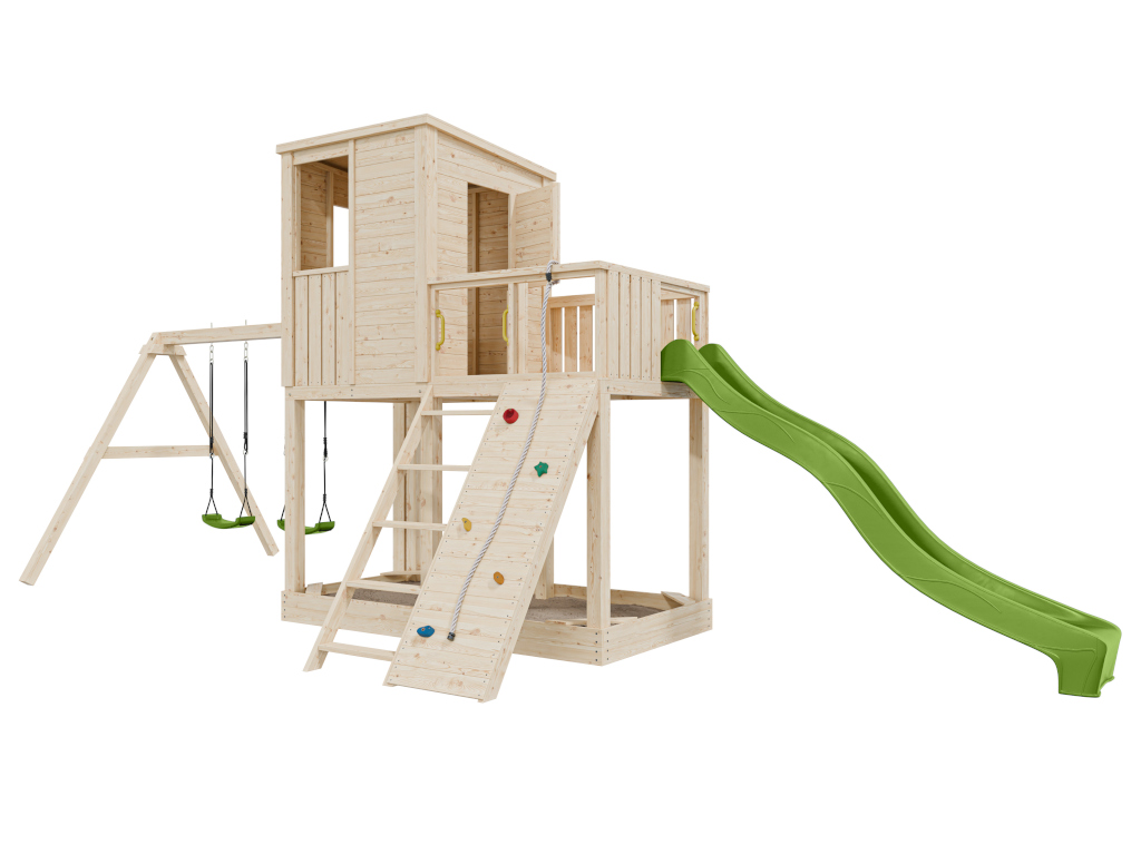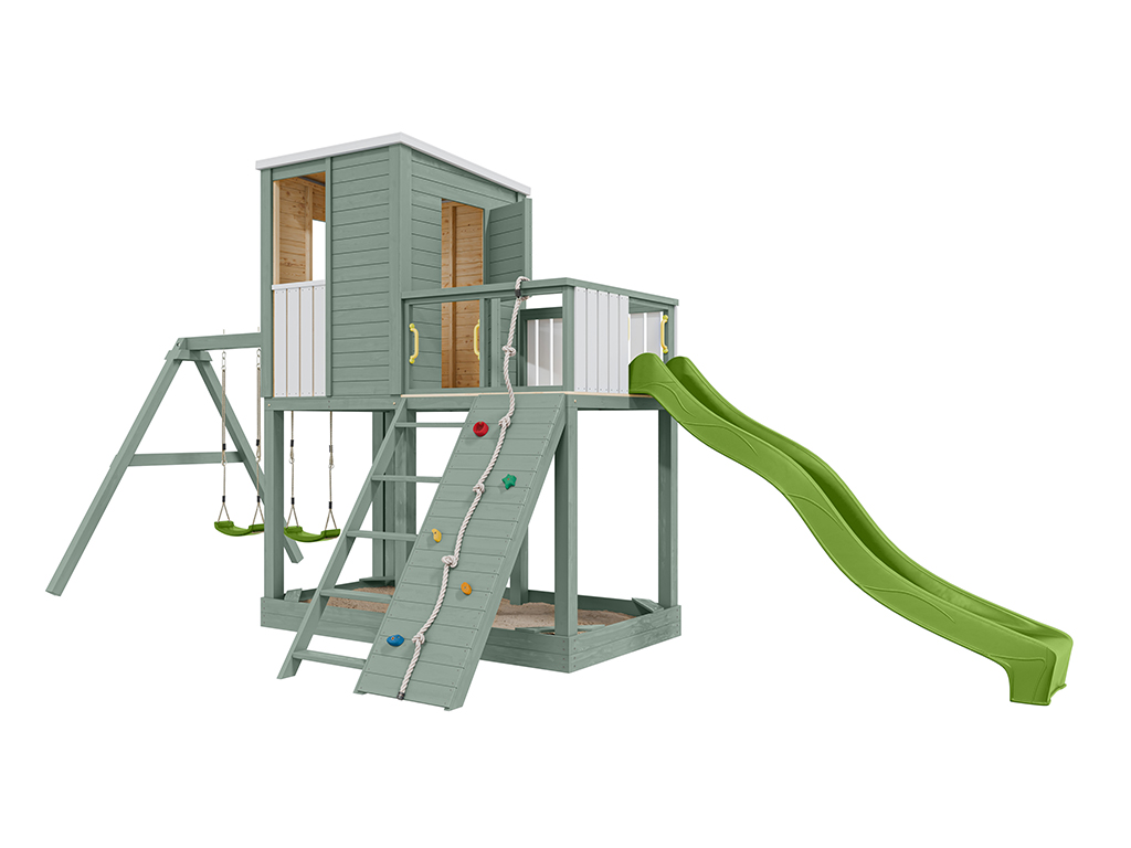 - 1 cabane sur pilotis Carl avec portique double ; 1 corde, 5 prises d'escalade (colorées), 4 poignées (jaunes), 2 sièges de balançoire (verts), 1 toboggan (vert citron), 1 escalier, mur d'escalade et jardinière