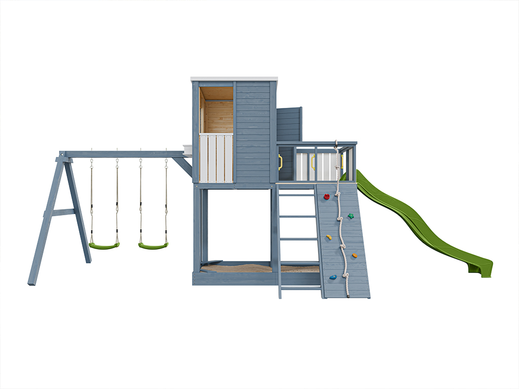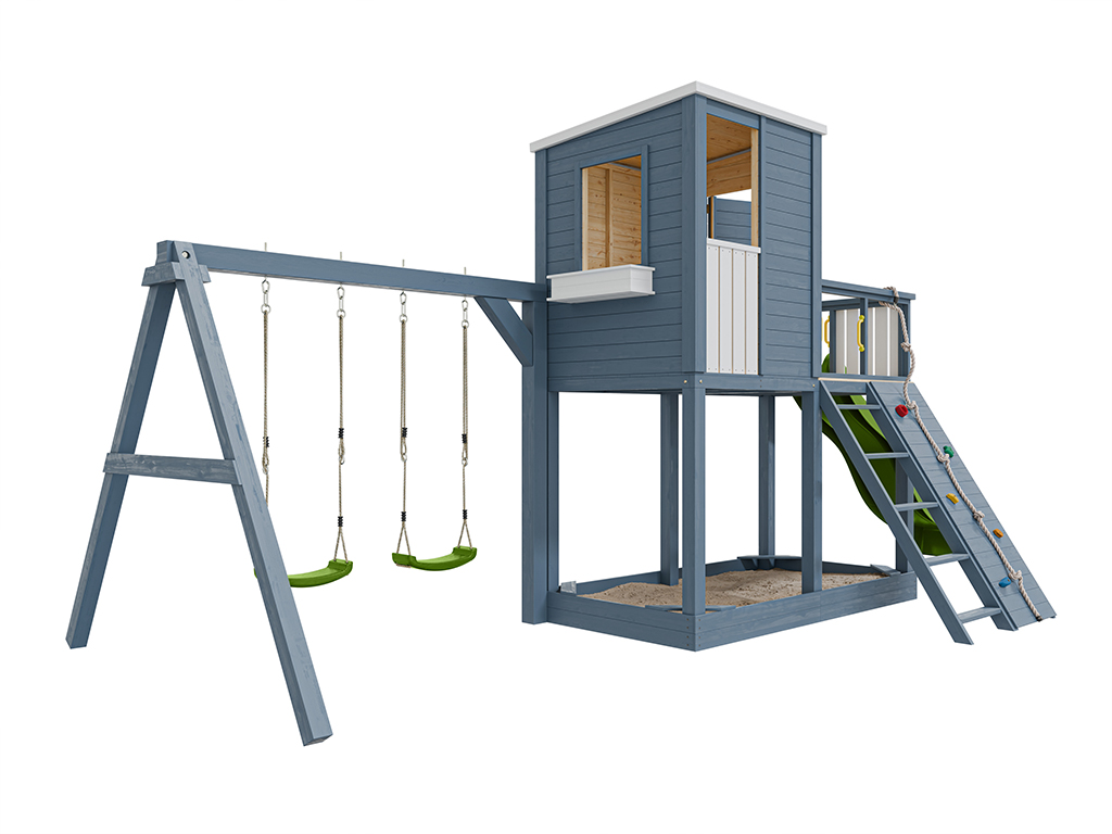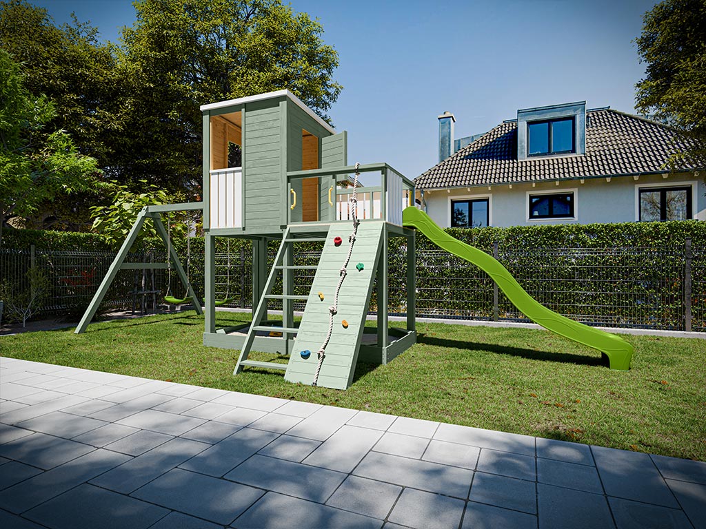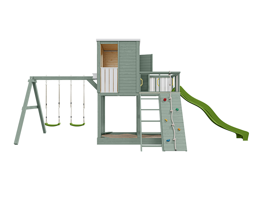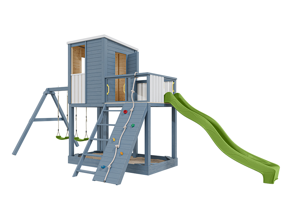 - 1 cabane sur pilotis Carl avec portique double ; 1 corde, 5 prises d'escalade (colorées), 4 poignées (jaunes), 2 sièges de balançoire (verts), 1 toboggan (vert citron), 1 escalier, mur d'escalade et jardinière